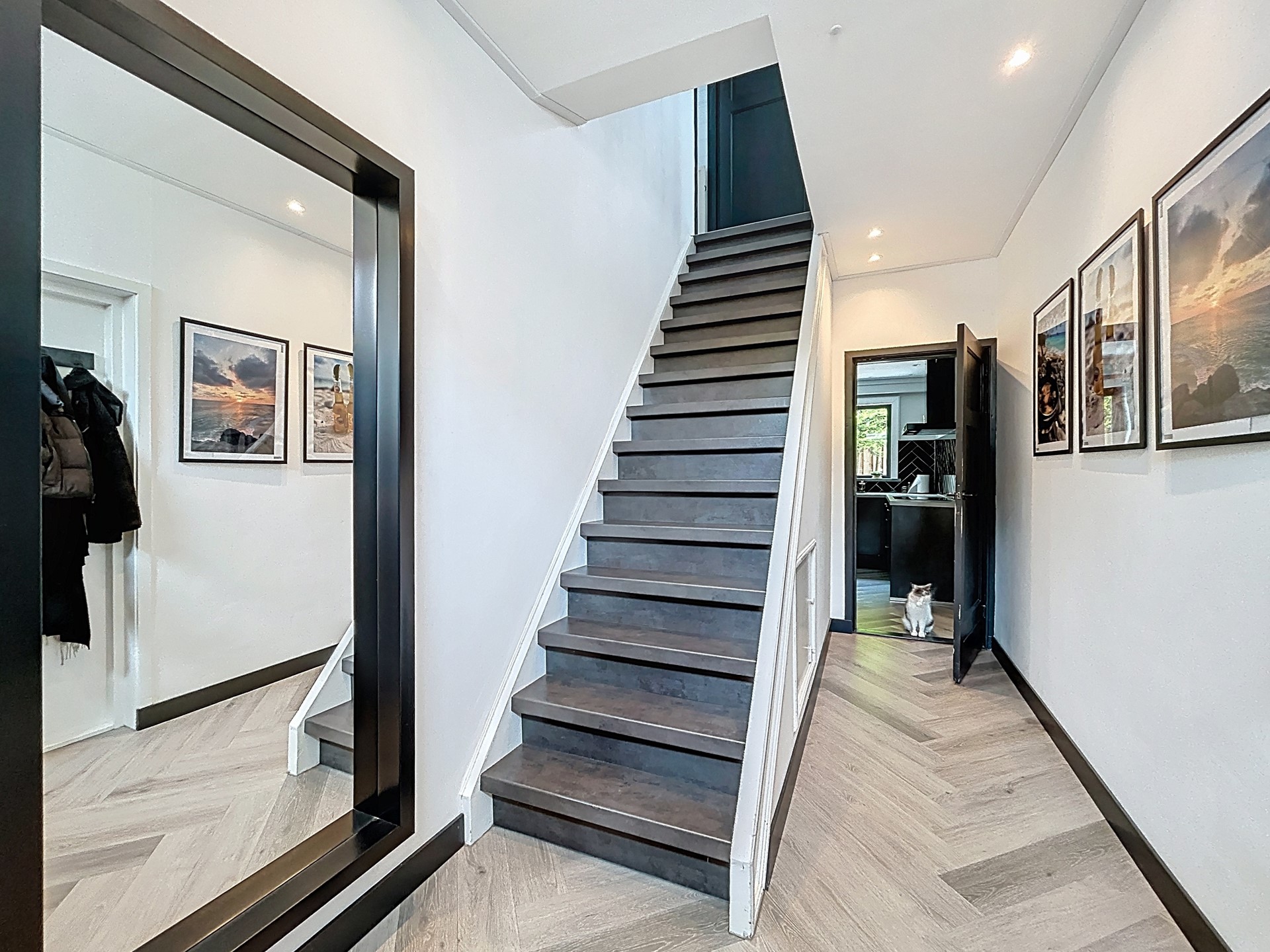 Bij aankomst bij de woning is aan de buitenzijde de kwaliteit al te zien: De pas geschilderde voorgevel en de luxe kozijnen geven het startschot. We betreden de woning middels de voordeur om in de hal uit te komen. Hier is direct goed te zien hoe fris en modern de woning oogt. Mooie strakke en fraai geschilderde muren, inbouwspots en een nette visgraadvloer, een uitstekende afwerking dus! Dit en de rest van de afwerking in het huis is allemaal gerealiseerd in 2020. De hal biedt plaats voor de nieuwe en zeer uitgebreide meterkast, een kapstok/schoenenrek en de trapopgang naar de eerste verdieping. Eerst wordt de moderne keuken betreden. Deze is ook in 2020 geplaatst en voorziet in apparaten als de combi-oven, koel- en vrieskast, inductiekookplaat met afzuigkap en vaatwasser. Verder is er nog een toegang tot de trapkast voorzien. Vervolgens betreden we de woonkamer. Ook hier is die moderne uitstraling een genot voor het oog. De ruime woonkamer biedt plaats voor een gezellige zithoek en een eettafel voor 6 personen. Het grote raam aan de voorzijde en de schuifpui aan de achterzijde zorgen voor veel lichtinval. Prachtig is hier ook de elektrische sfeerhaard. Tenslotte gaan we weer terug naar de keuken om langs daar de bijkeuken te betreden. Deze is verrassend ruim dankzij de gang die doorloopt tot de voorzijde. Hierdoor heb je je doorgang van voor naar achteren. De bijkeuken biedt verder nog plaats voor een spoelbak, de CV-ketel (2020), extra groepenkast én het toilet.