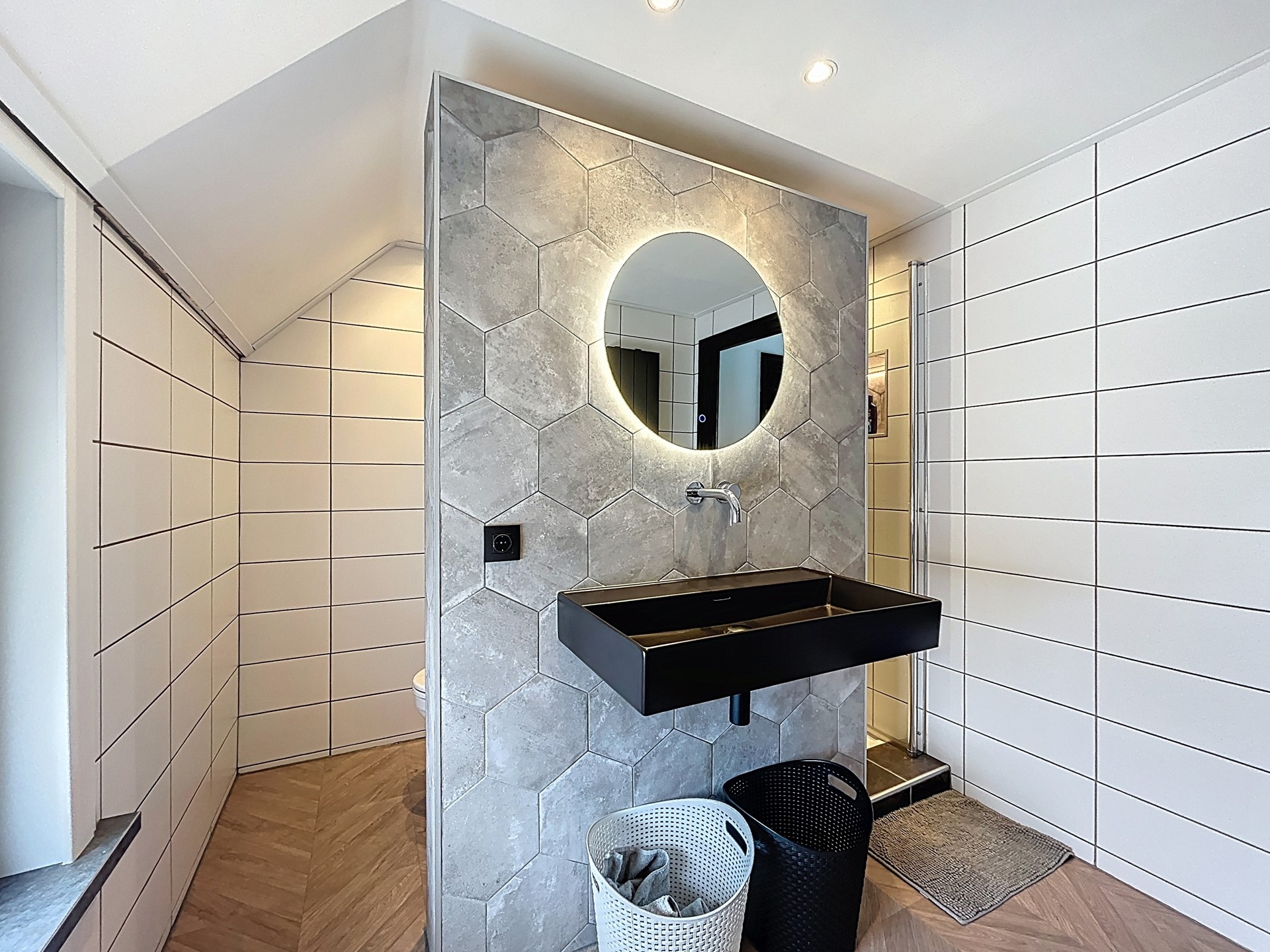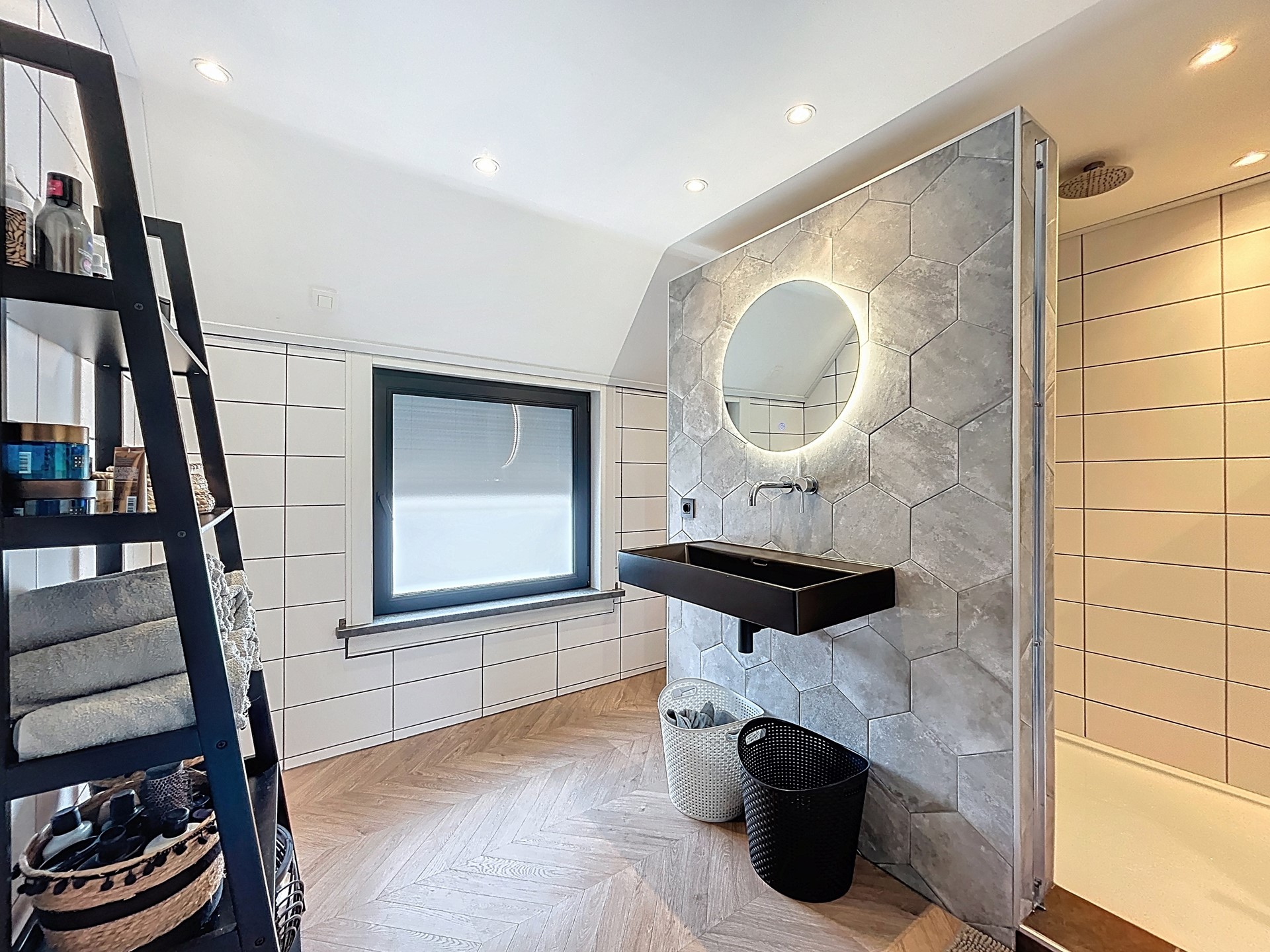 Middels de nieuw beklede trap in de hal wordt de overloop van de eerste verdieping betreden. Deze overloop biedt toegang tot de twee ruime slaapkamers, de badkamer en de wasruimte. De twee grote slaapkamers zijn groot genoeg voor een tweepersoonsbed, een kledingkast én eventueel een bureau. De slaapkamer aan de achterzijde heeft nog een ‘geheime’ doorgang tot extra bergruimte. Ook de badkamer is in 2020 vernieuwd en ook dit is weer met kwaliteit en finesse gedaan. De fijne indeling en de goede materiaalkeuze bieden een wastafel met spiegel, een toilet en een ruime douche. Tenslotte is er nog een wasruimte voorzien met de wasmachineaansluiting.