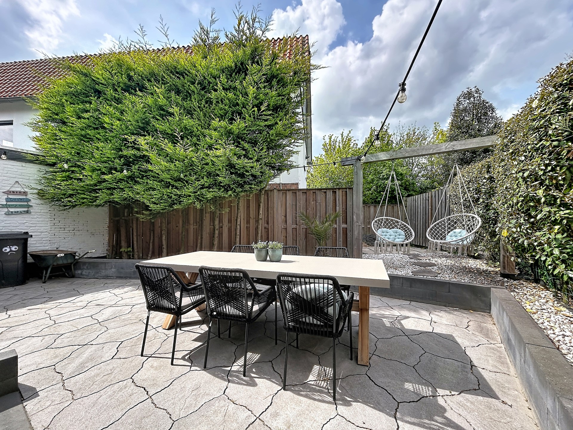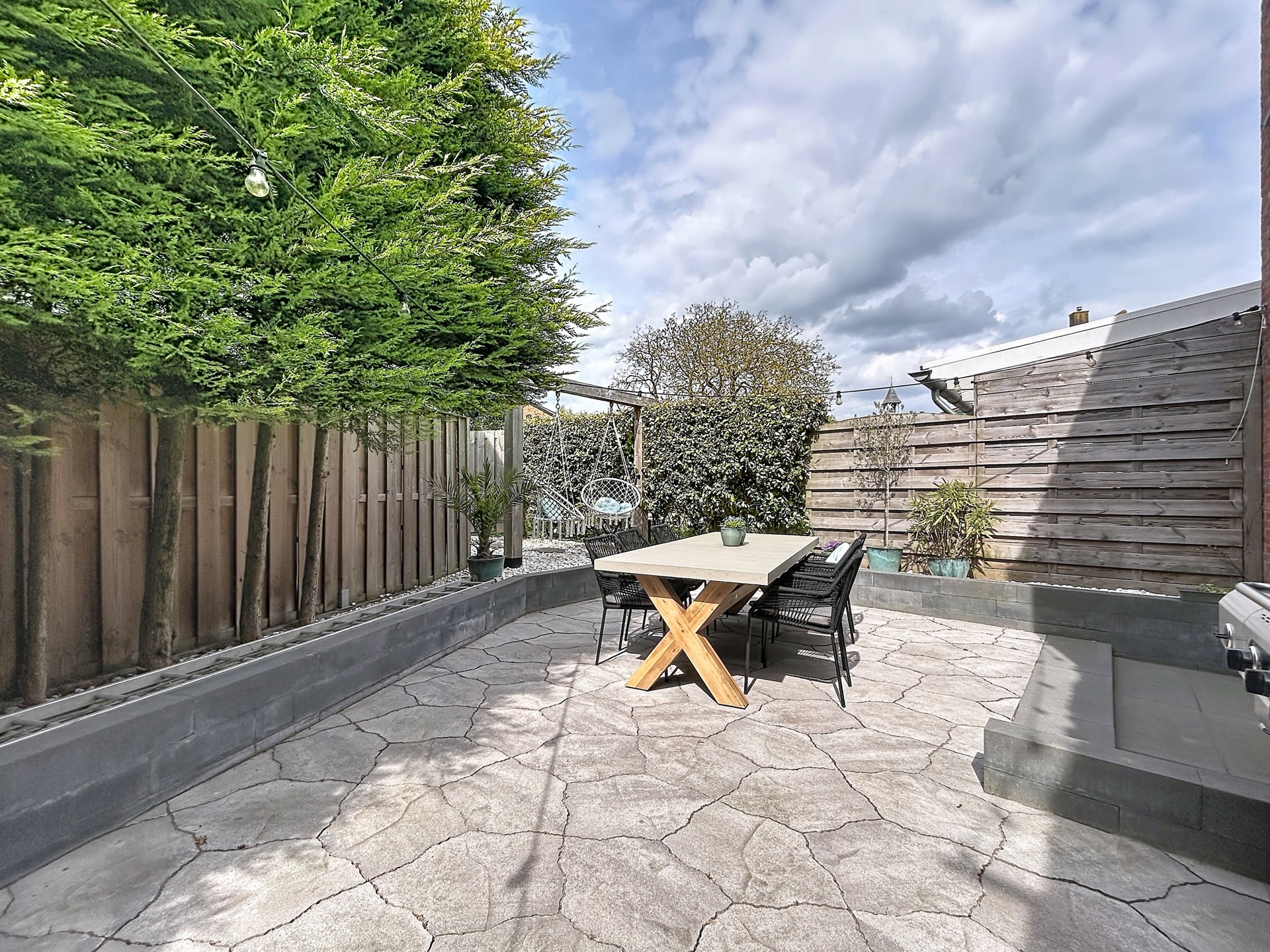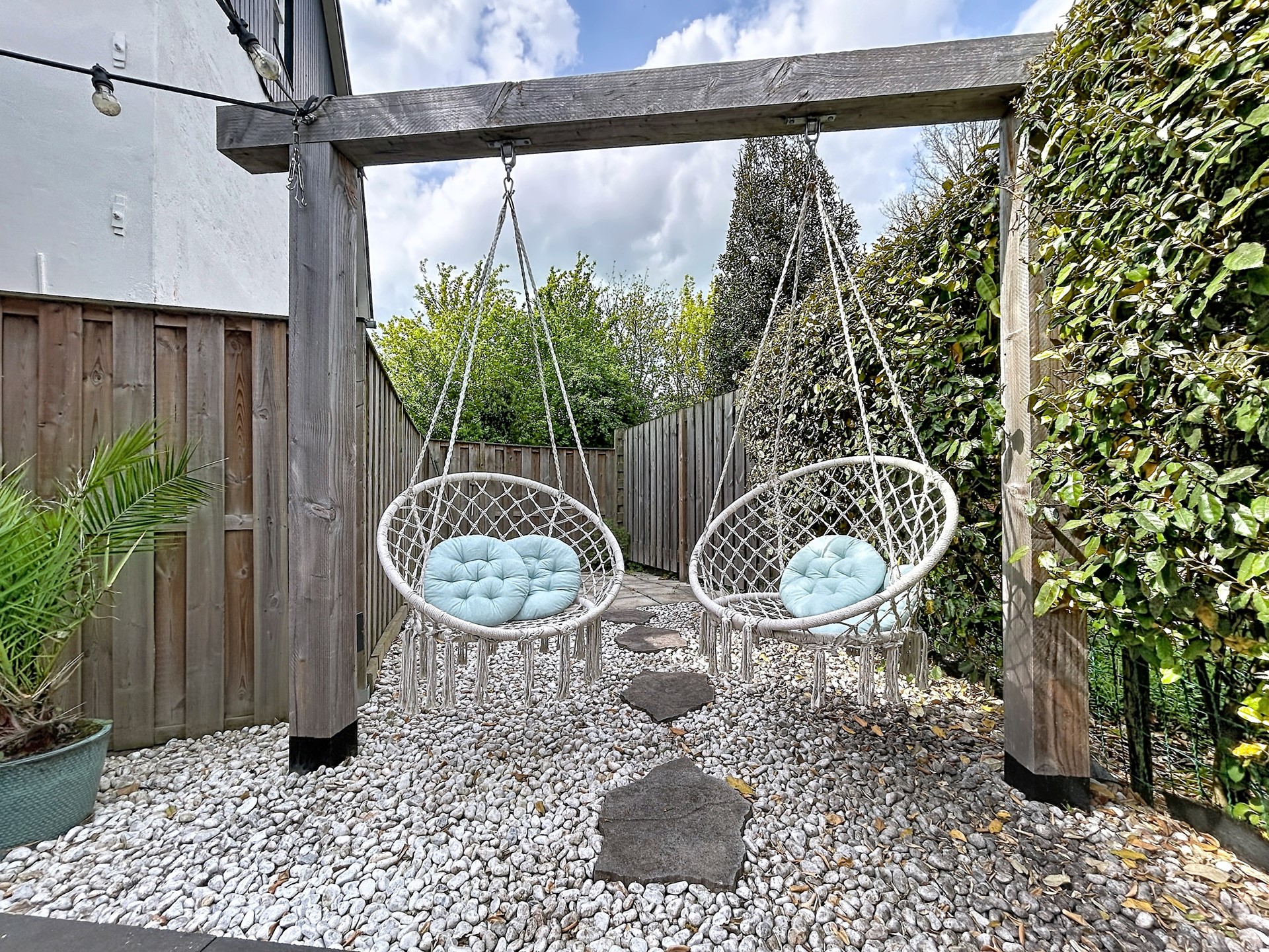 De achtertuin is nog maar net, in 2023, aangepakt. Via de achterdeur in de bijkeuken en de schuifpui in de woonkamer wordt deze betreden. De fraaie tegels zorgen voor een leuk terras aan de woning en aan de achterzijde. Aan de achterzijde zorgt het terras voor de ochtend- en middagzon. Daartussen is grind gelegd met een fraaie constructie voor twee hangstoelen of een schommel voor de kinderen.