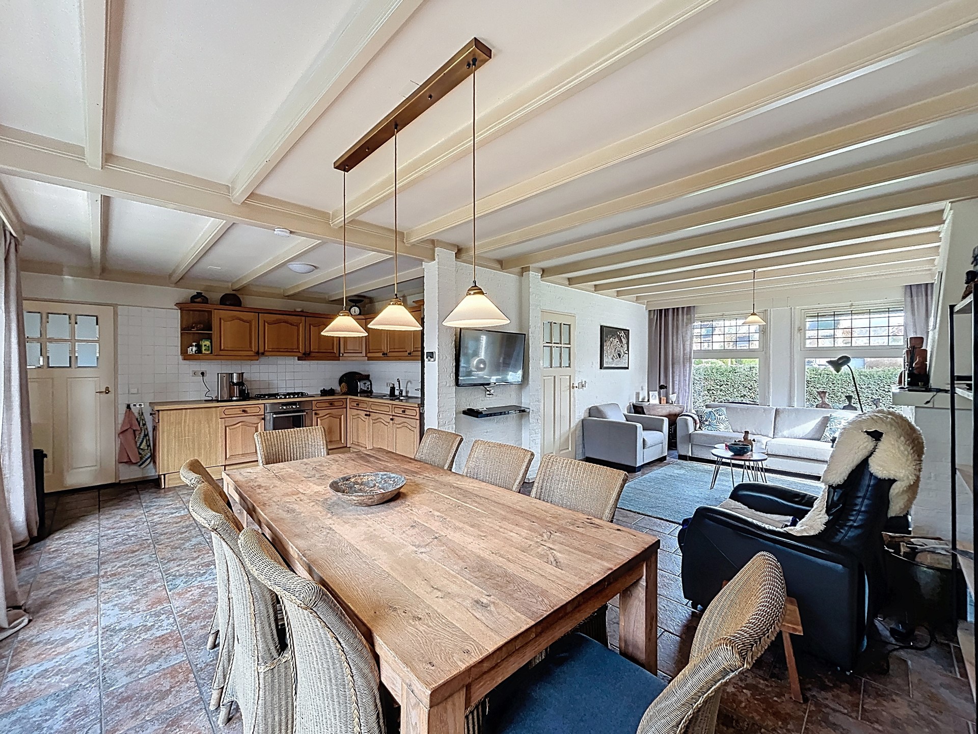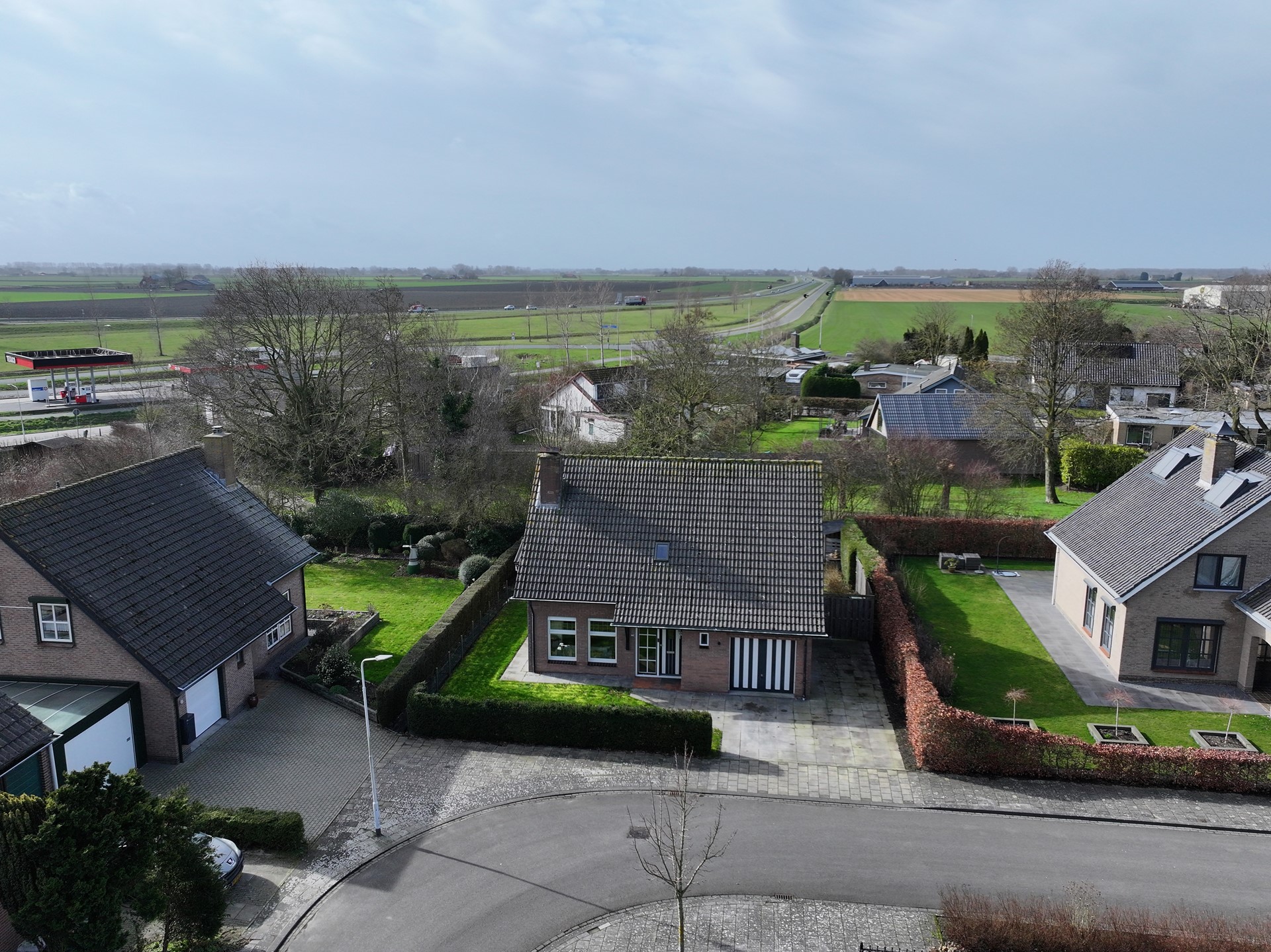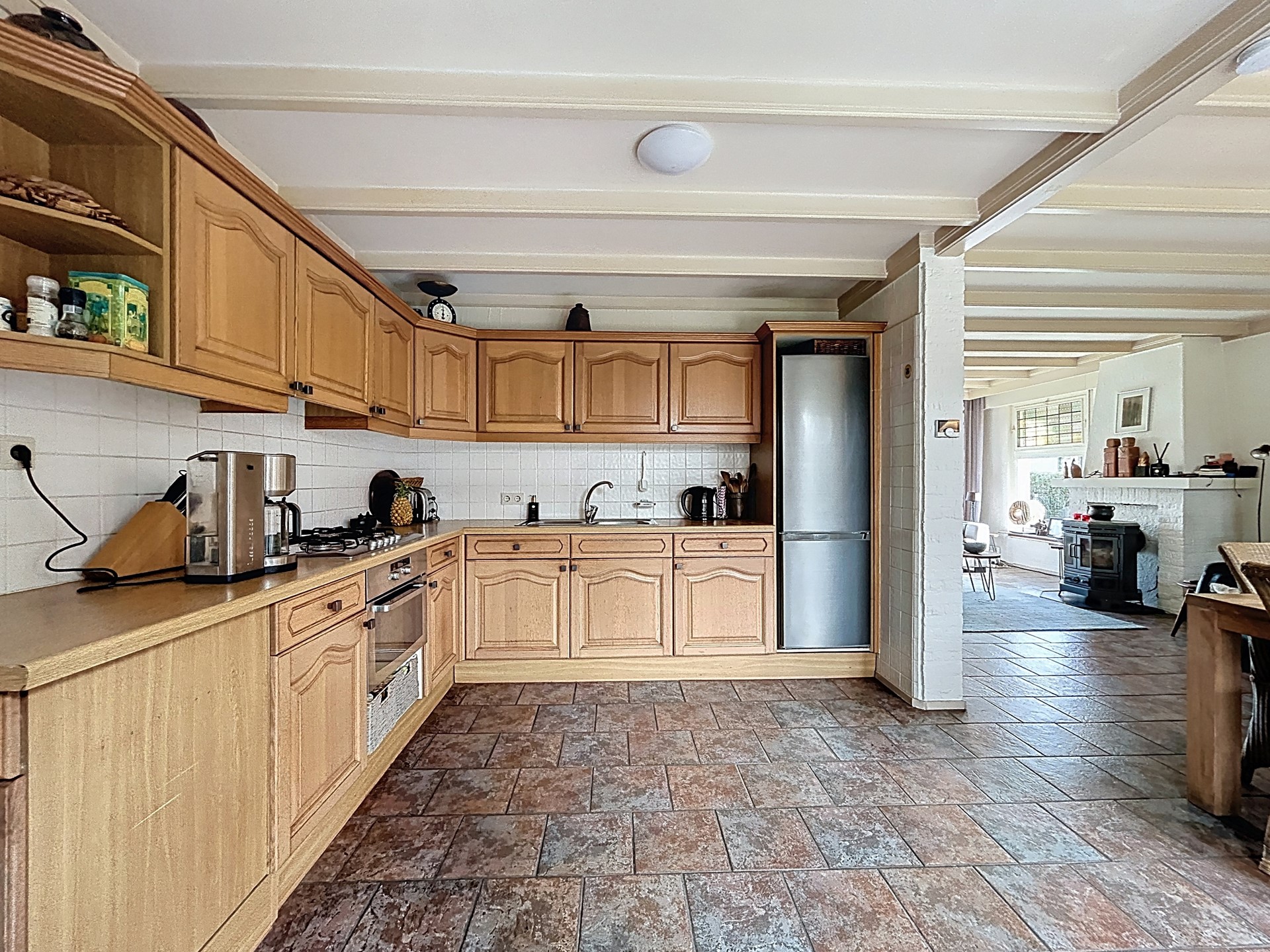 De vrijstaande woning is gelegen op het midden van een perceel van 403 m². Op de oprit heb je plaats voor twee auto’s, maar er is ook altijd voldoende plek in de straat. We betreden de woning middels de voordeur om in de royale entree uit te komen. Hier is direct de kwaliteit van de woning te zien: fraai schilderwerk, een nette tegelvloer en schitterende houten trap met open vide. In de entree zijn tevens het toilet, een garderobe en de meterkast (2018) voorzien. Vervolgens stappen we de woonkamer binnen. Alle ruimte hier voor een gezellige zithoek en een eethoek met open verbinding naar de keuken. Met de houtkachel wordt de ruimte sfeervol verwarmd. De tegelvloer en het plafond met houten balken maken de ruimte helemaal af. Aansluitend stap je zo de open keuken in. Deze is voorzien van apparaten als een koelkast, 5 gaspitten met afzuigkap, een spoelbak en daarnaast veel opbergruimte. Vervolgens lopen we via de bijkeuken naar de inpandige garage. De bijkeuken biedt ruimte om de vaatwasser, wasmachine en droger te plaatsen. Ook is hier de CV-ketel uit 2016 te vinden. De garage heeft voldoende opslagruimte.
