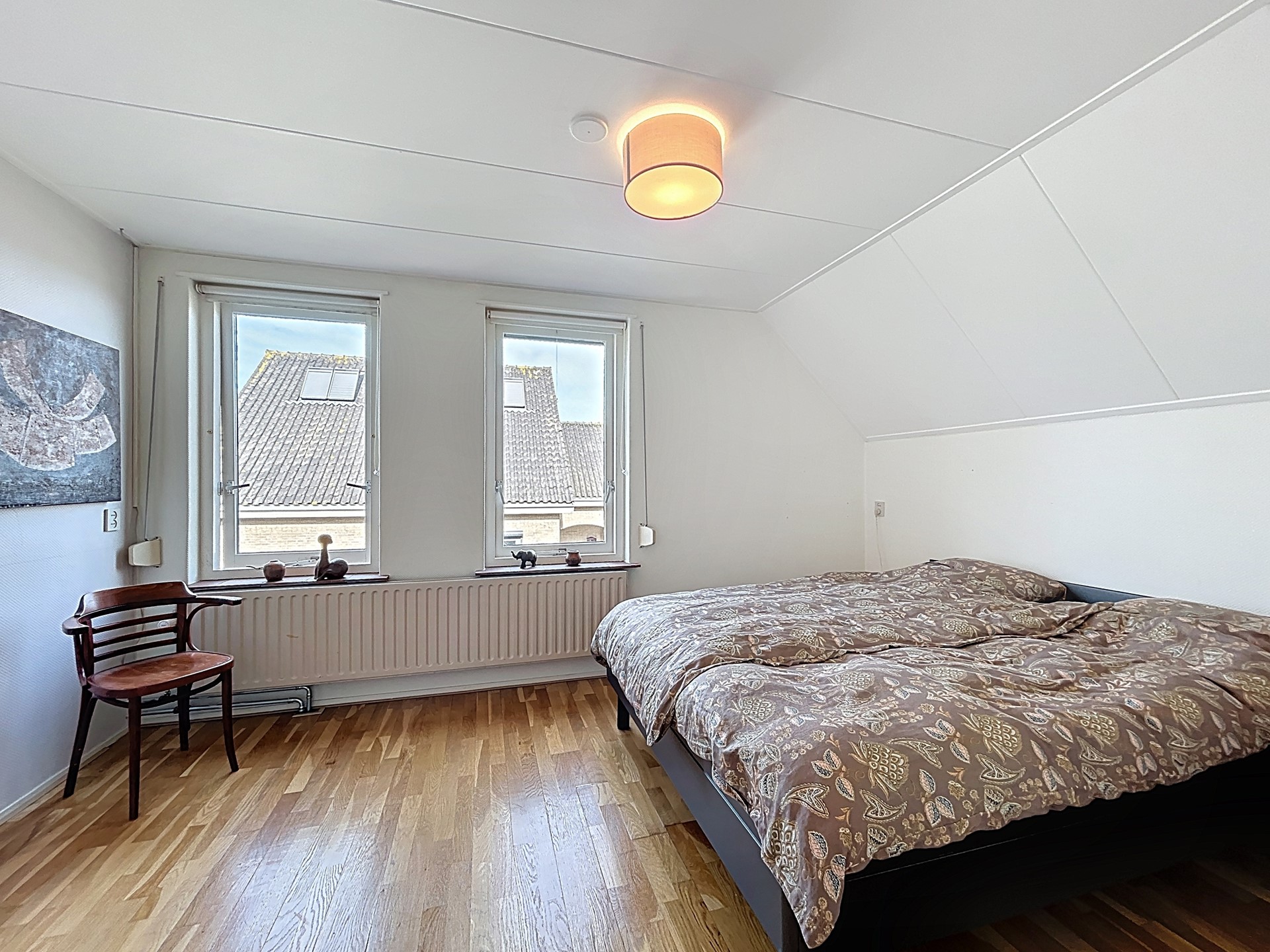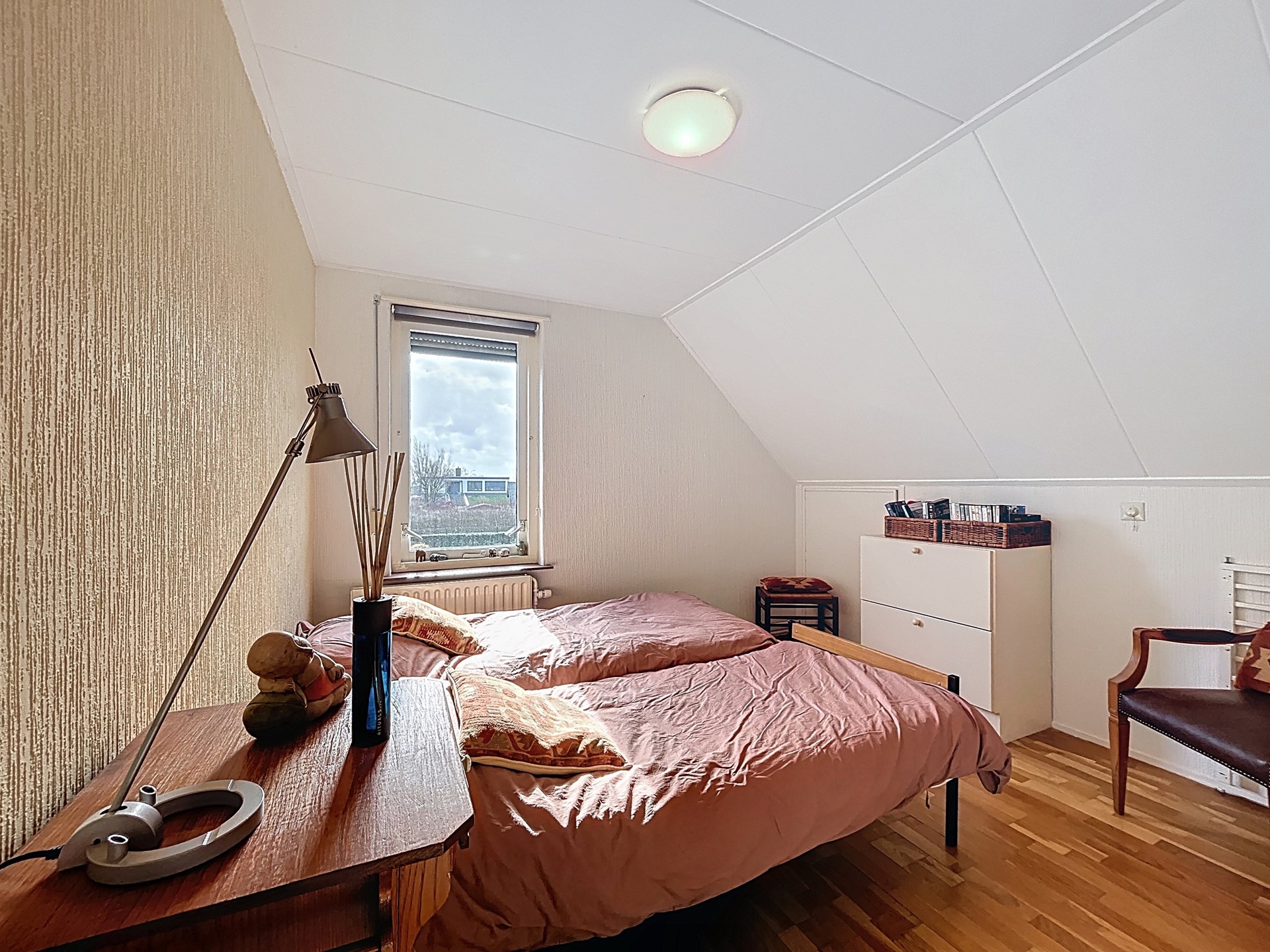 Middels de trap in de entree wordt de overloop van de verdieping betreden. Deze overloop biedt toegang tot de drie slaapkamers, een berging en de royale badkamer. Alle slaapkamers zijn ruim van opzet en bieden allen de ruimte voor een tweepersoonsbed, een kledingkast en eventueel zelfs een bureau. Onder de schuine kanten zijn opbergkasten voorzien. Tenslotte hebben we nog de badkamer. Deze kan gemoderniseerd worden, maar biedt wel plaats voor een toilet, een heerlijk ligbad, een wastafel en een douche. Ook komt er nog eens veel licht binnen dankzij het grote velux-dakraam.