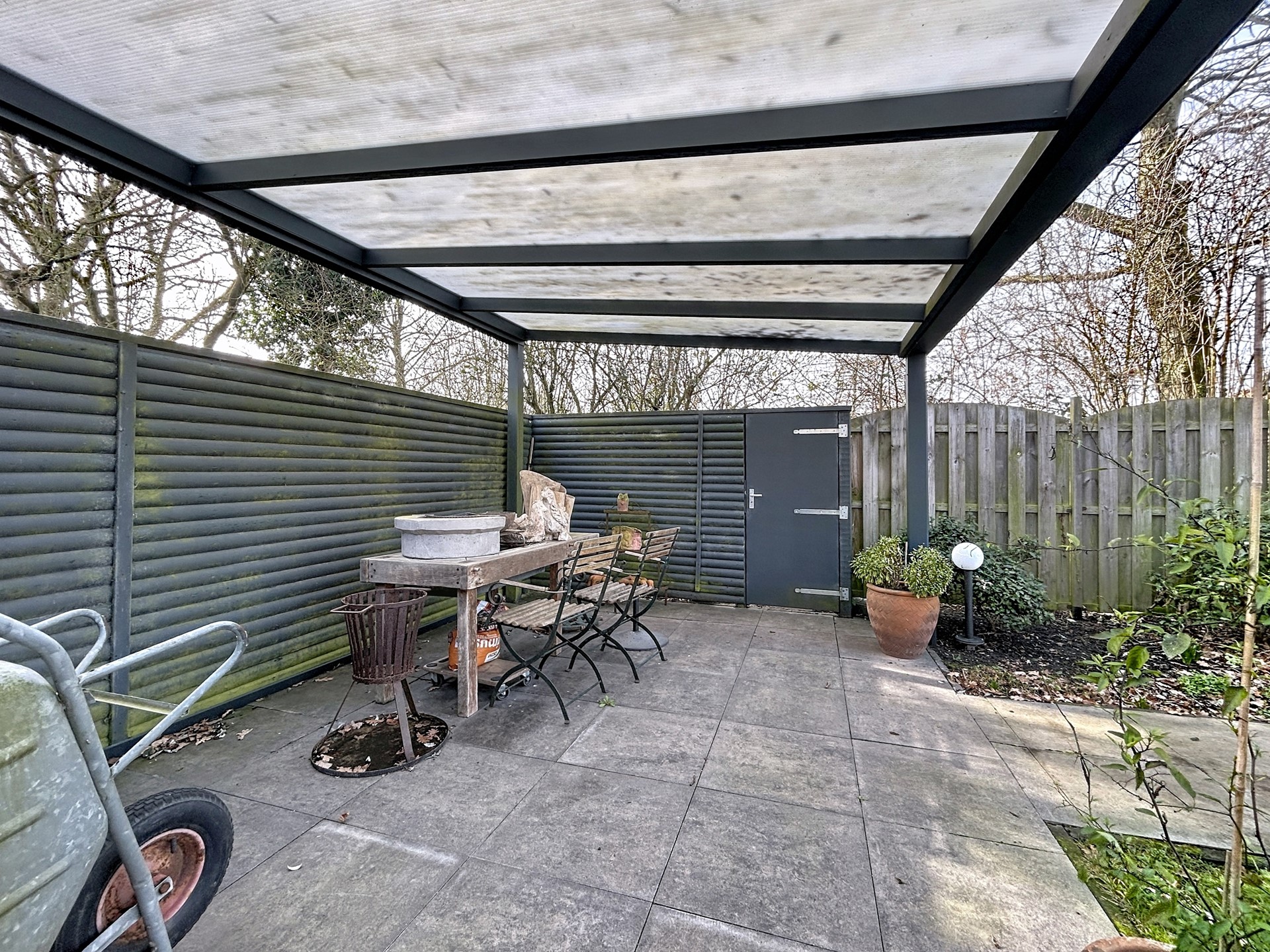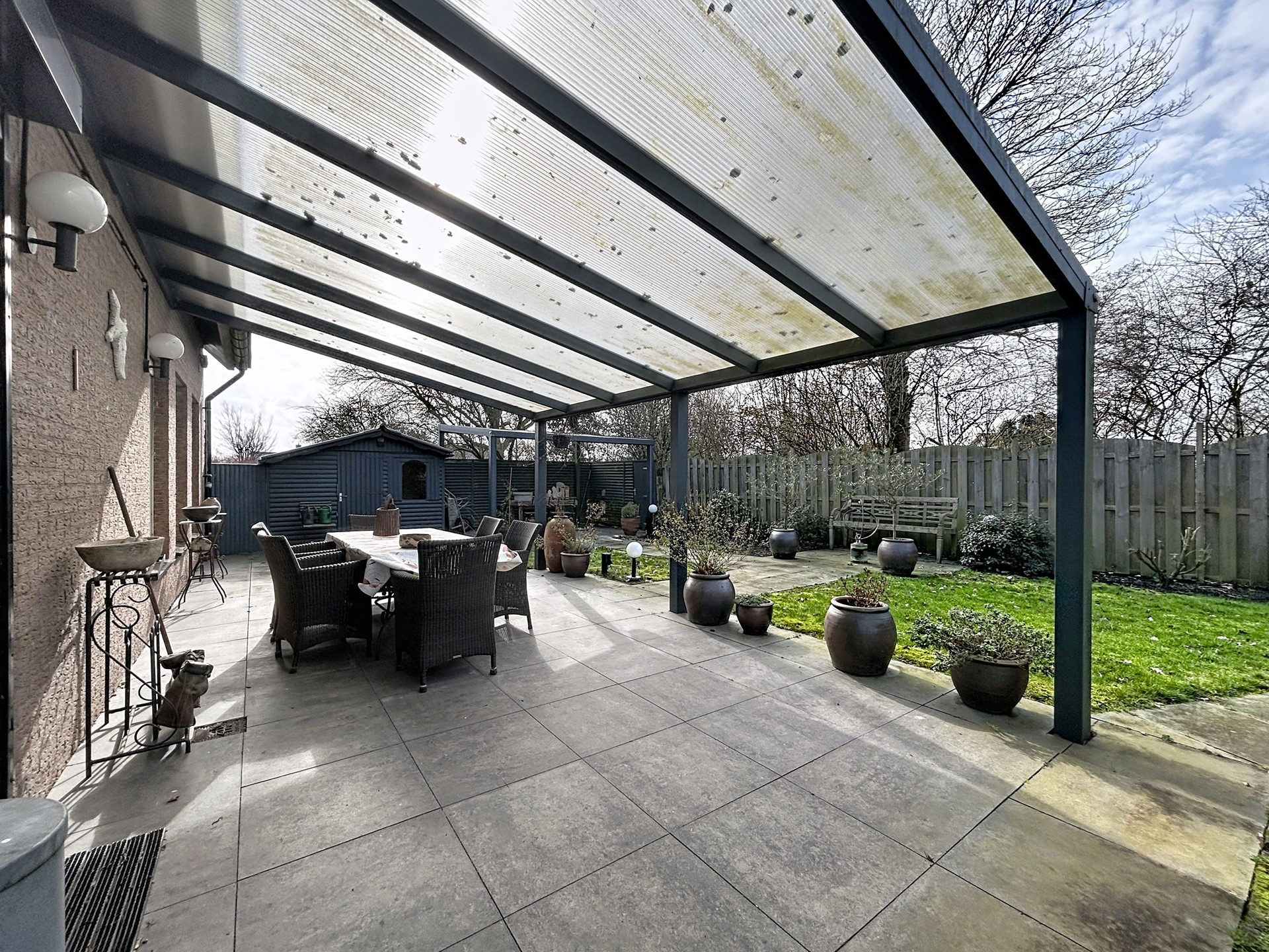 De tuin heeft een fijne ligging op het Westen. Hierdoor heb je vanaf 12u altijd wel ergens de zon. Met de royale veranda van 22 m² kan je ook in de zomer koel zitten of droog wanneer het regent. Het tuinhuis biedt nog de nodige opslag voor je tuinmateriaal. De tuin is verder goed onderhouden en het perceel is gelegen tegen een park aan de achterzijde, waardoor je geen achterburen hebt.