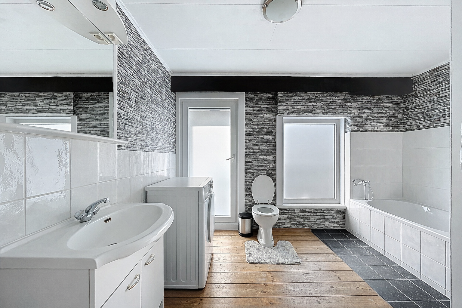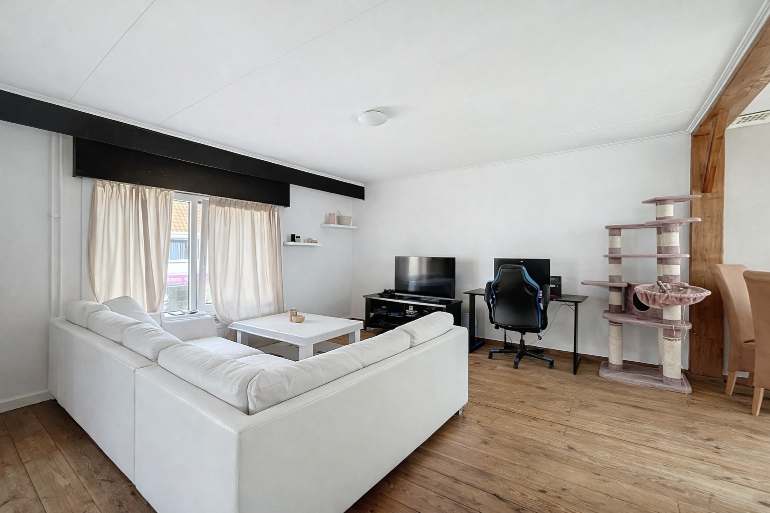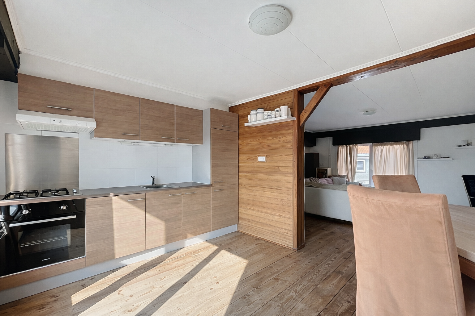 We gaan weer terug naar het pand om met de trap naar boven te gaan voor de eerste verdieping. Deze verdieping is ingericht als woongedeelte met woonkamer, keuken en badkamer. In het woongedeelte heb je meer dan genoeg ruimte voor een gezellige zithoek, een bureau en een eettafel. Daarnaast is het voorzien van een moderne keuken met koel- en vrieskast, vaatwasser, een oven en 4 gaspitten met afzuigkap. Ook de badkamer is erg ruim met een toilet, wastafel, ligbad en een inloopdouche. Daarnaast is het mogelijk om hier je wasmachine te plaatsen. Mocht je op de begane grond je woonruimte creëren, dan is het goed mogelijk om hier tot wel drie extra slaapkamers te creëren.