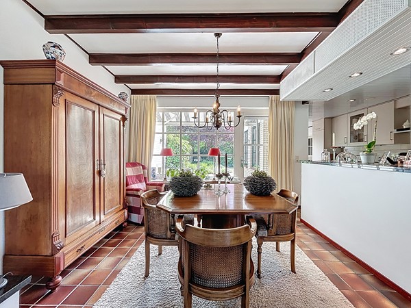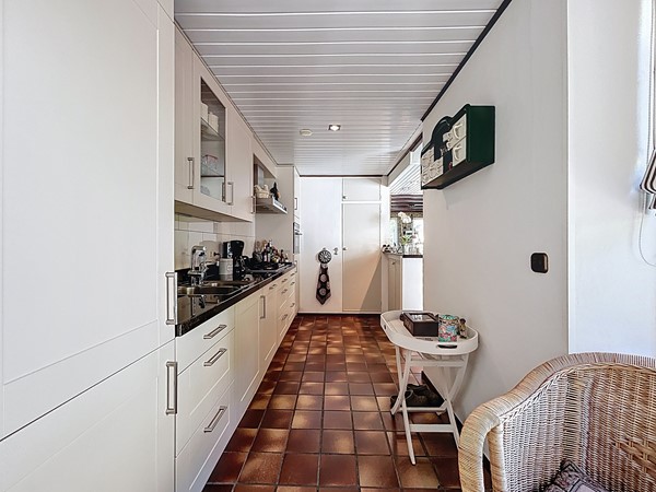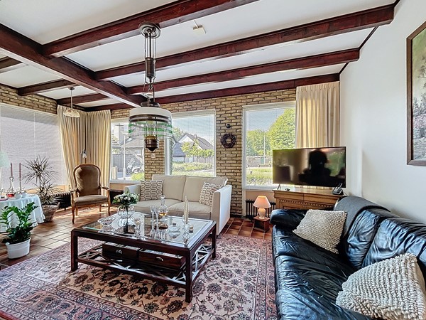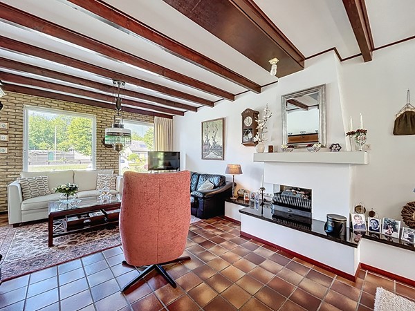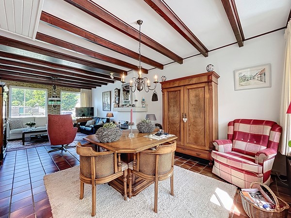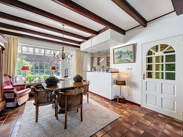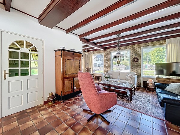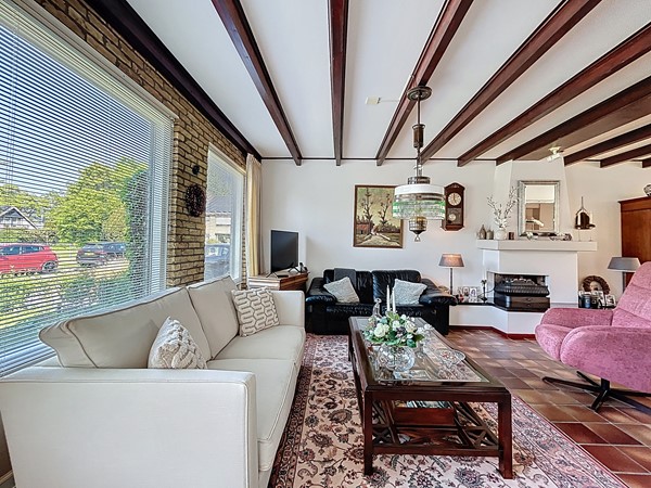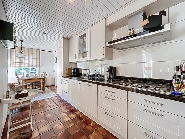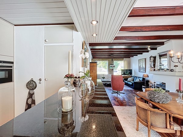 Bij aankomst bij de woning parkeer je de auto op de ruime oprit. Tevens is er genoeg parkeergelegenheid in de straat. Aan de voortuin is al te zien hoe goed er voor dit plekje gezorgd wordt. Middels de voordeur (langs de oprit) wordt de entree betreden. Deze ruime hal biedt genoeg plaats voor een garderobe en is voorzien van de meterkast en de open trapopgang. Tevens biedt het toegang tot het toilet. Een mooi detail is de raampartijen tussen de woonkamer en de hal, wat een nog ruimtelijker gevoel geeft. Vervolgens betreden we de L-vormige woonkamer. De woning is breder dan gebruikelijk, waardoor ook de woonkamer zeer royaal te noemen is, zeker dankzij de open verbinding met de keuken en aanbouw. Aan de voorzijde heb je alle ruimte voor een gezellige zithoek en aan de achterzijde kan de lange eettafel staan, met fraai zicht over de tuin en de keuken. In het midden is een sfeervolle open haard voorzien. De keuken is in 2010 vernieuwd en voorzien van inbouwkasten, veel opslag, een 5-pits gastoestel met afzuigkap, een Quooker, een combi-oven, de vaatwasser en een koel- en vrieskast. Aan voorzieningen dus geen gebrek! Een leuke toevoeging is dat er achter de keuken nog ruimte is voor een extra eettafel. Tenslotte wordt langs daar ook de bijkeuken met aansluitend de garage betreden. De bijkeuken is goed te gebruiken voor de witgoedvoorzieningen en de garage is groot genoeg voor de auto en fietsen.