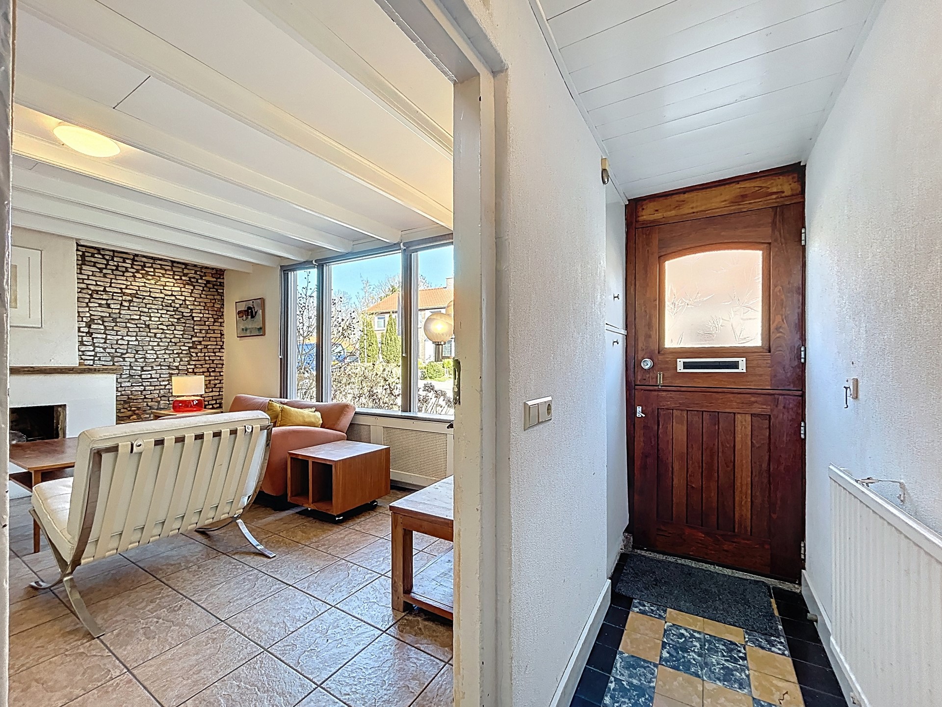 De voordeur is een leuke hardhouten staldeur, waarvan de boven- en onderkant afzonderlijk van elkaar open kunnen. Eenmaal in de gang valt de fraaie tegelvloer gelijk op. Tevens is hier de vernieuwde meterkast te vinden. Loop je de gang helemaal door, dan betreden we de moderne en ruime badkamer met douche, toilet en wastafel. Ga je in de gang gelijk rechtsaf, dan betreden we de woonkamer. Deze gezellige woonkamer biedt verrassend veel ruimte voor een gezellige zithoek. De karakteristieke eigenschappen zorgen hier voor de sfeer, denk daarbij aan het balkenplafond, de gemetselde muur en de open haard. Ook krijg je veel licht binnen van het grote raamkozijn. Vervolgens betreden we de keuken en ook deze is ruimer dan je zou denken met genoeg plaats voor een eettafel en de keuken met apparatuur (oven, 4-gaspitten, losse vaatwasser en afzuigkap). Een leuke toevoeging is hier de steen die als eerste is gelegd in 1859. Het verplaatsen tussen de ruimtes is ook charmant te noemen met de authentieke binnendeuren.