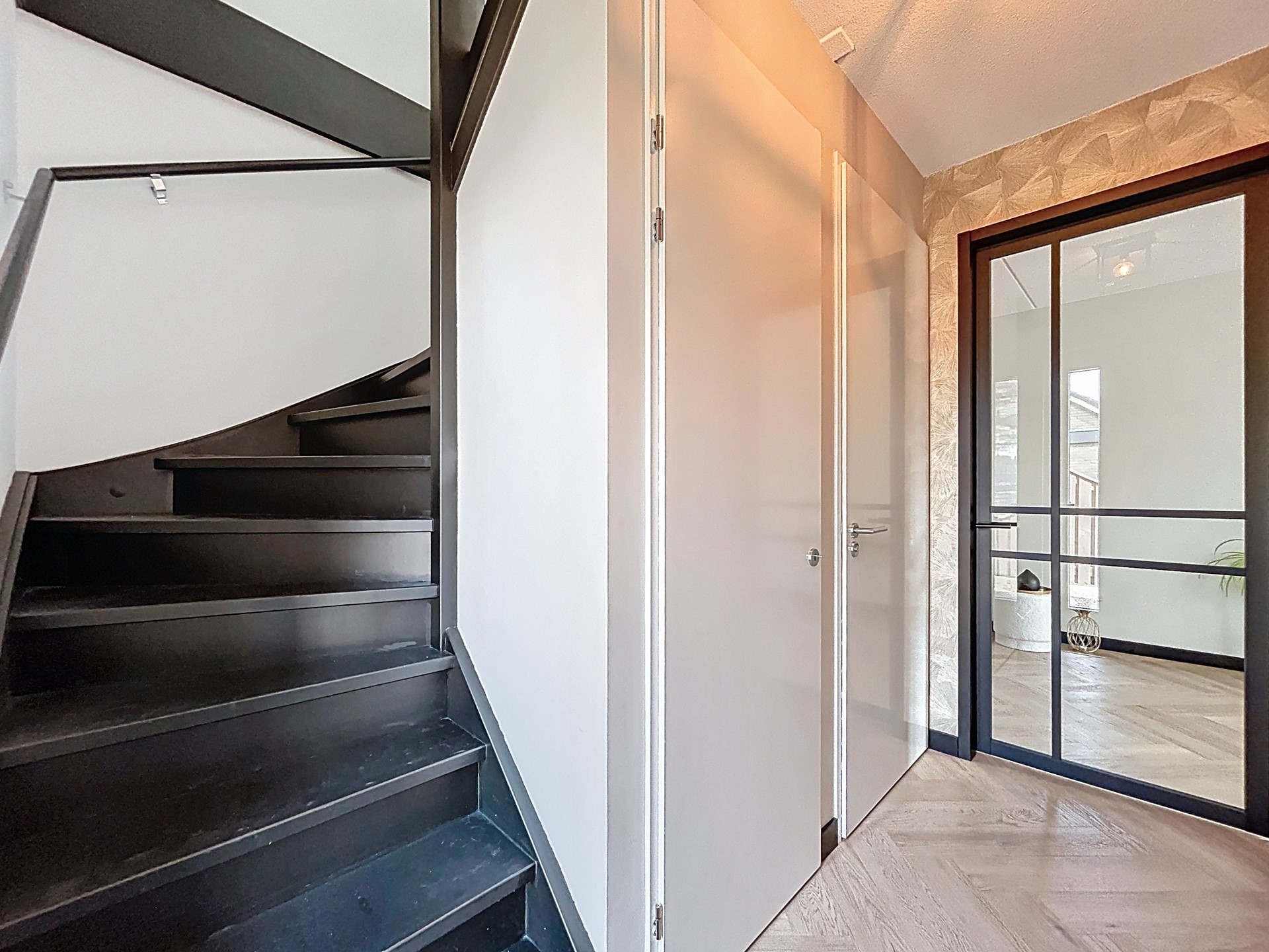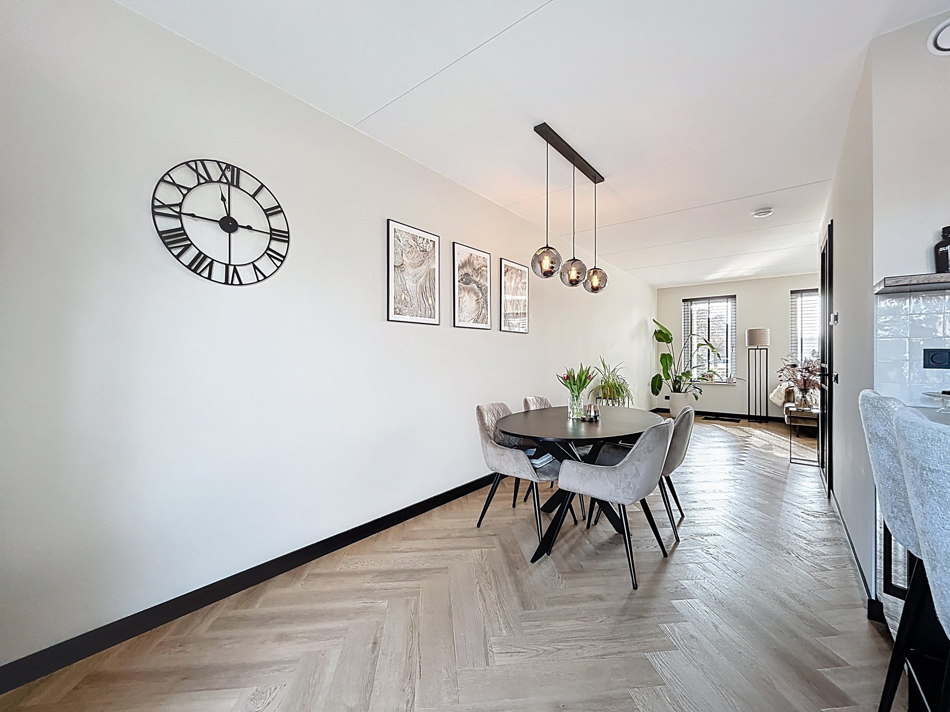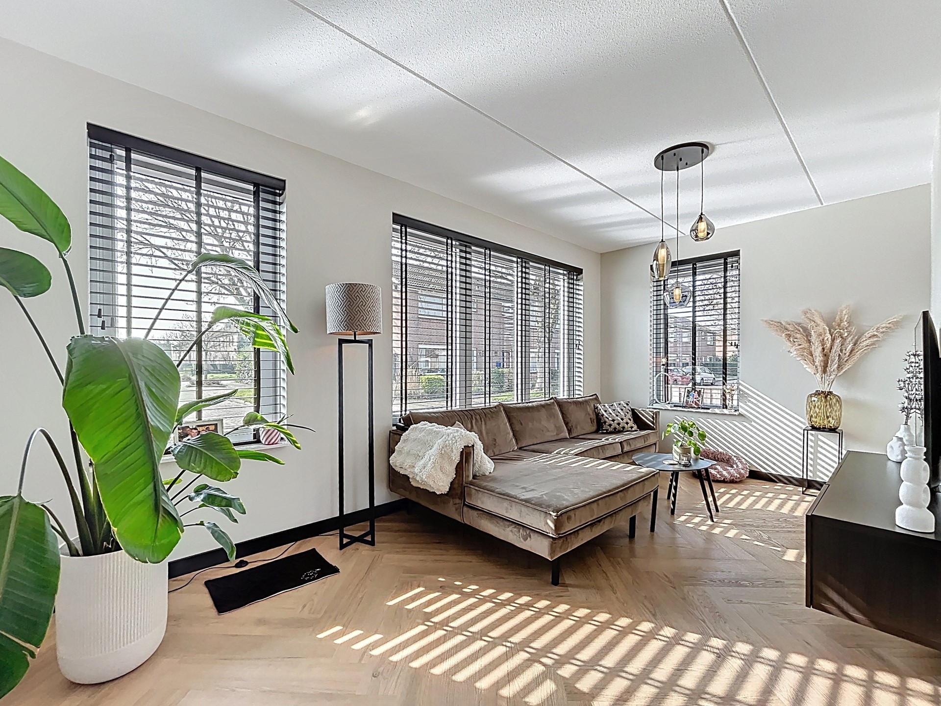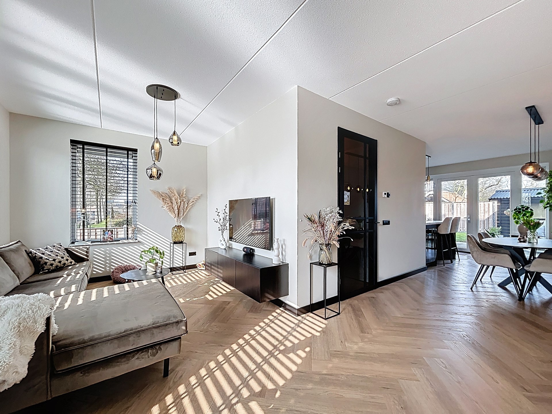 Een groot pluspunt aan deze woning is dat je een vrij uitzicht op de straat hebt. In de straat is voldoende parkeergelegenheid voorzien, waardoor je altijd de auto kan parkeren. De auto parkeer je tevens makkelijk op de eigen oprit. Aan de zijkant wordt middels de antracietgrijze kunststof voordeur de hal betreden met de meterkast, het toilet en de vurenhouten trap met op maat gemaakte trapkast, waar ook een voorraadkast in te vinden is. In de hal heb je alle ruimte voor een garderobe. Vervolgens stap je de woonkamer binnen via de glazen binnendeur met aan de voorkant van de woning de woonkamer met vele raampartijen en aan de achterkant de keuken en eetkamer met openslaande tuindeuren. De begane grond- en verdiepingsvloeren zijn zandcementvloeren van 70 mm dik. Op de begane grond is deze vloer prachtig afgewerkt met een fraaie PVC-visgraat-vloer. De vloeren zijn op beide verdiepingen voorzien van vraaggestuurde vloerverwarming en vloerkoeling en de wanden zijn strak gestuct. Tenslotte is er een uitgebreide luxe keuken in gegaan aan de achterzijde van de woning. Deze keuken is voorzien van een fraai en uitgestrekt blad, een bar, een klimaatkast, een inductiekookplaat met Bora-afzuiging, een vaatwasser, een Quooker en een stoomoven. Daarnaast is er ruimte gemaakt om een losse koelkast te plaatsen.