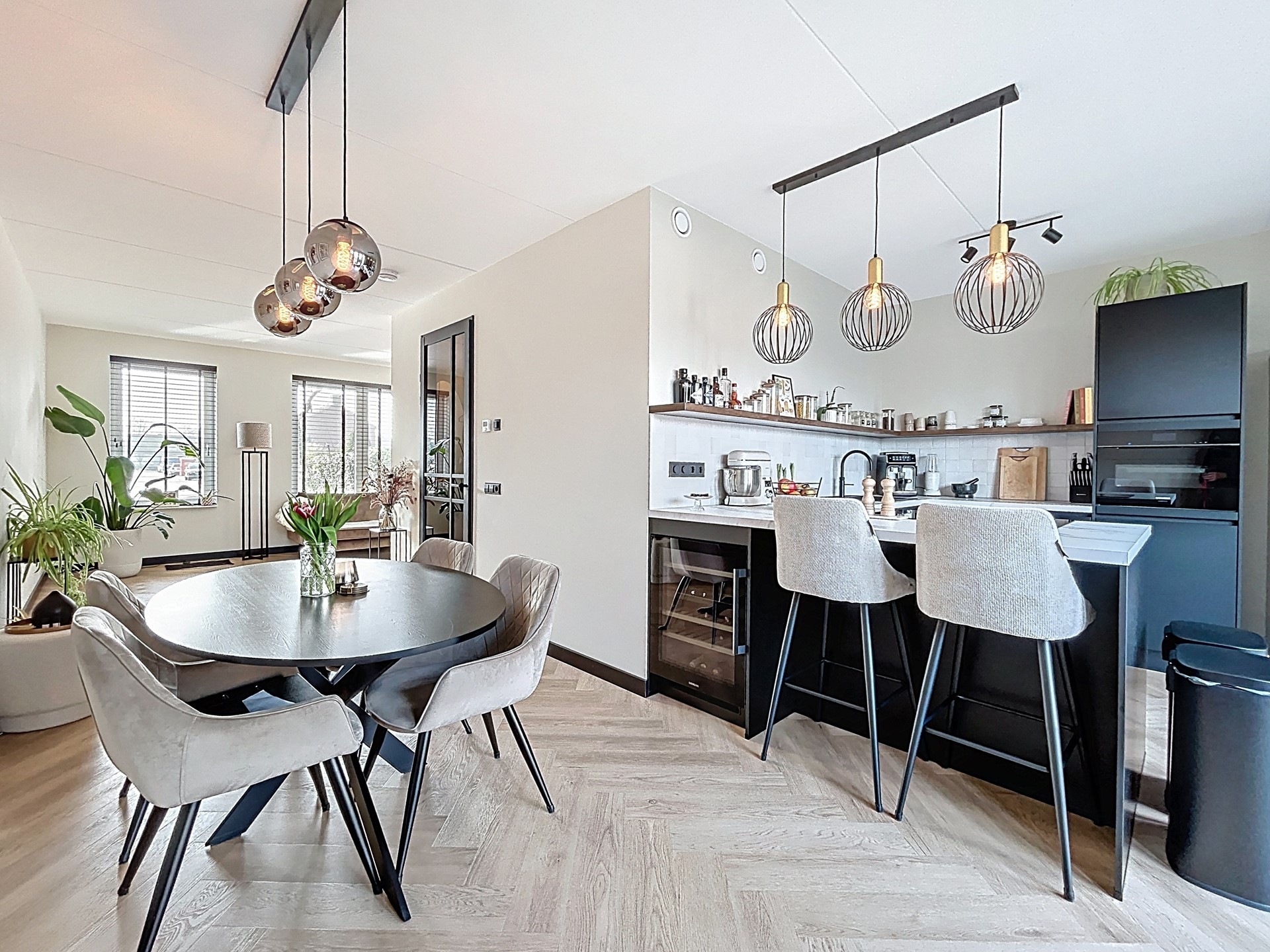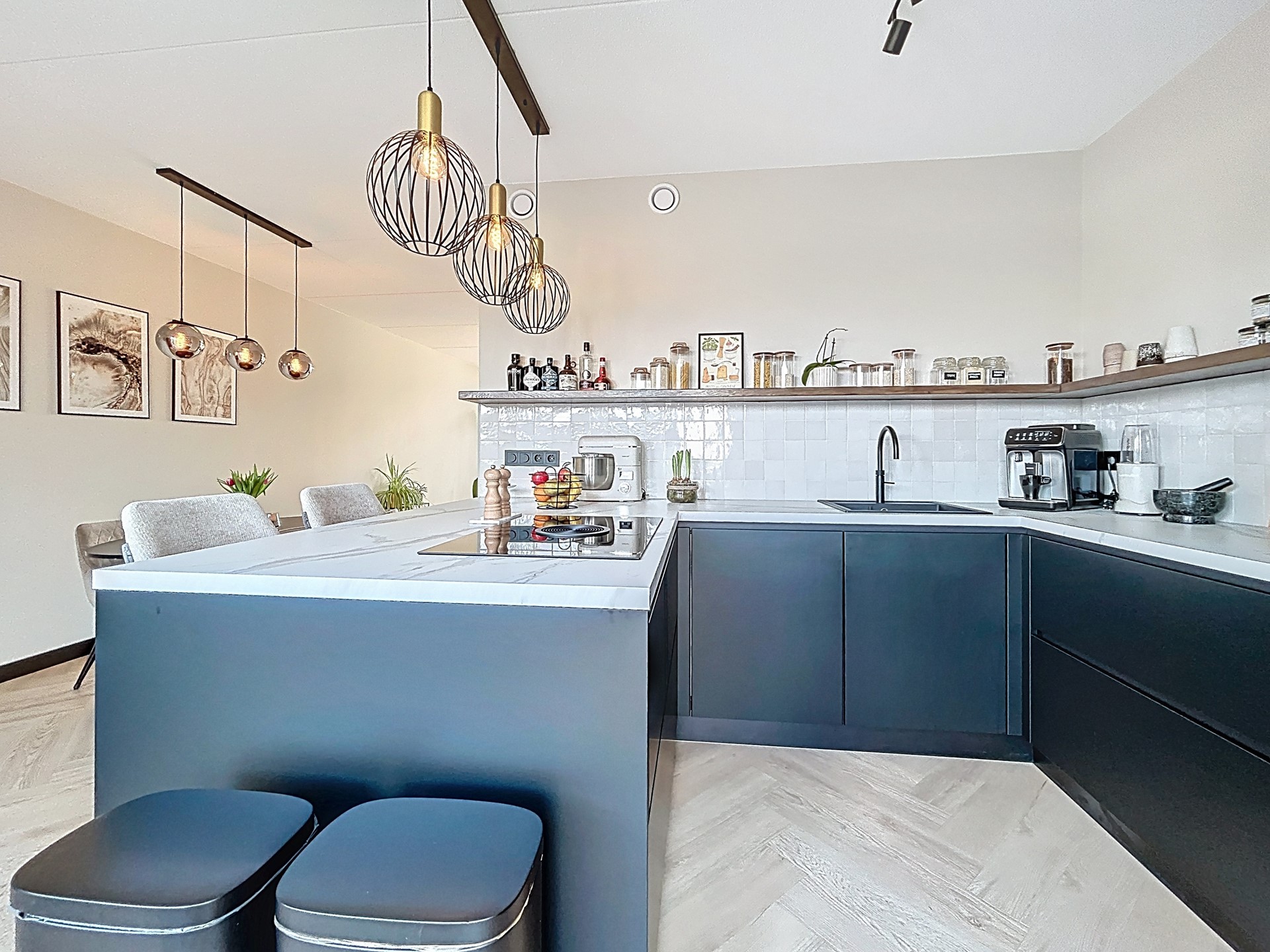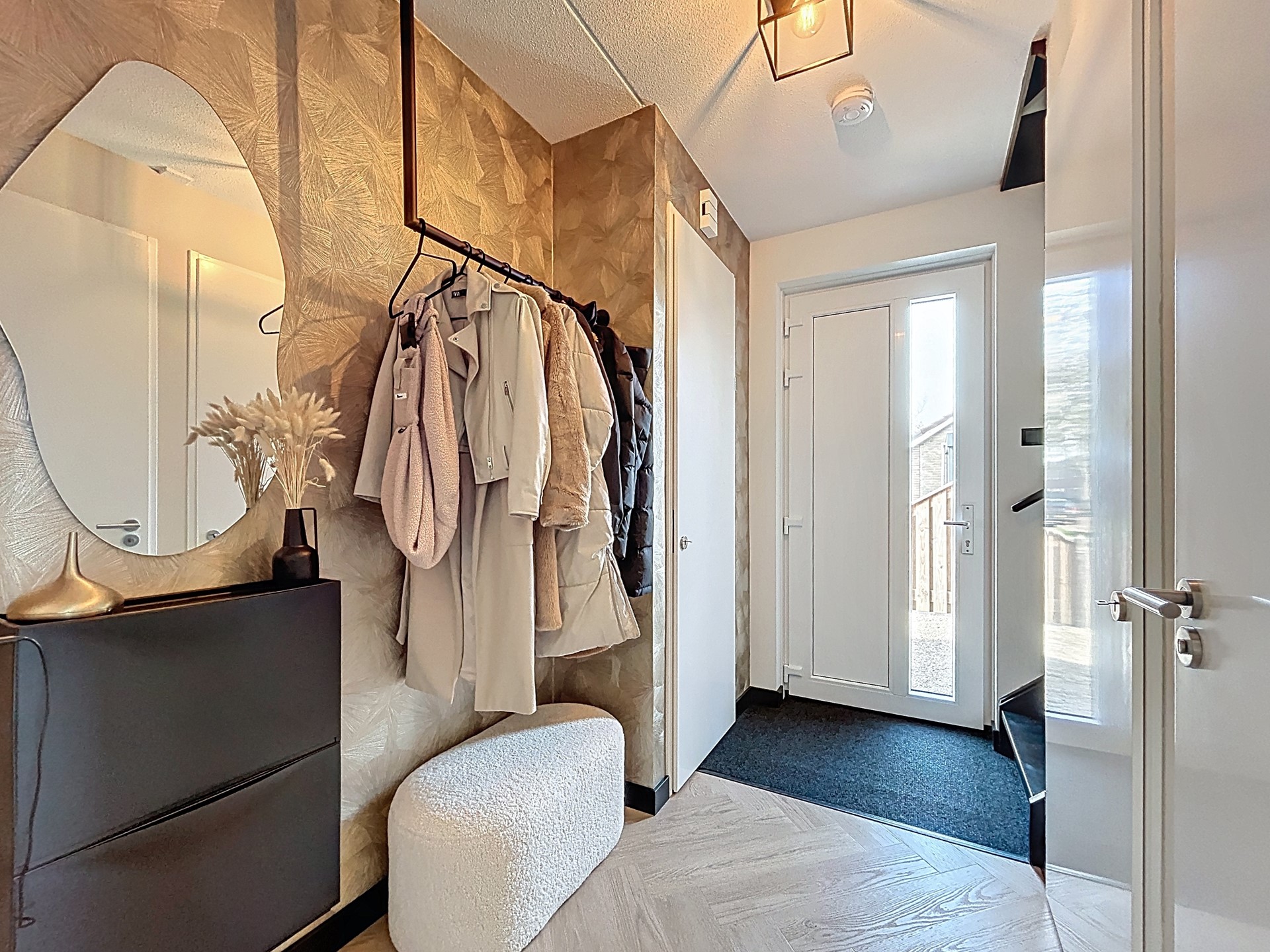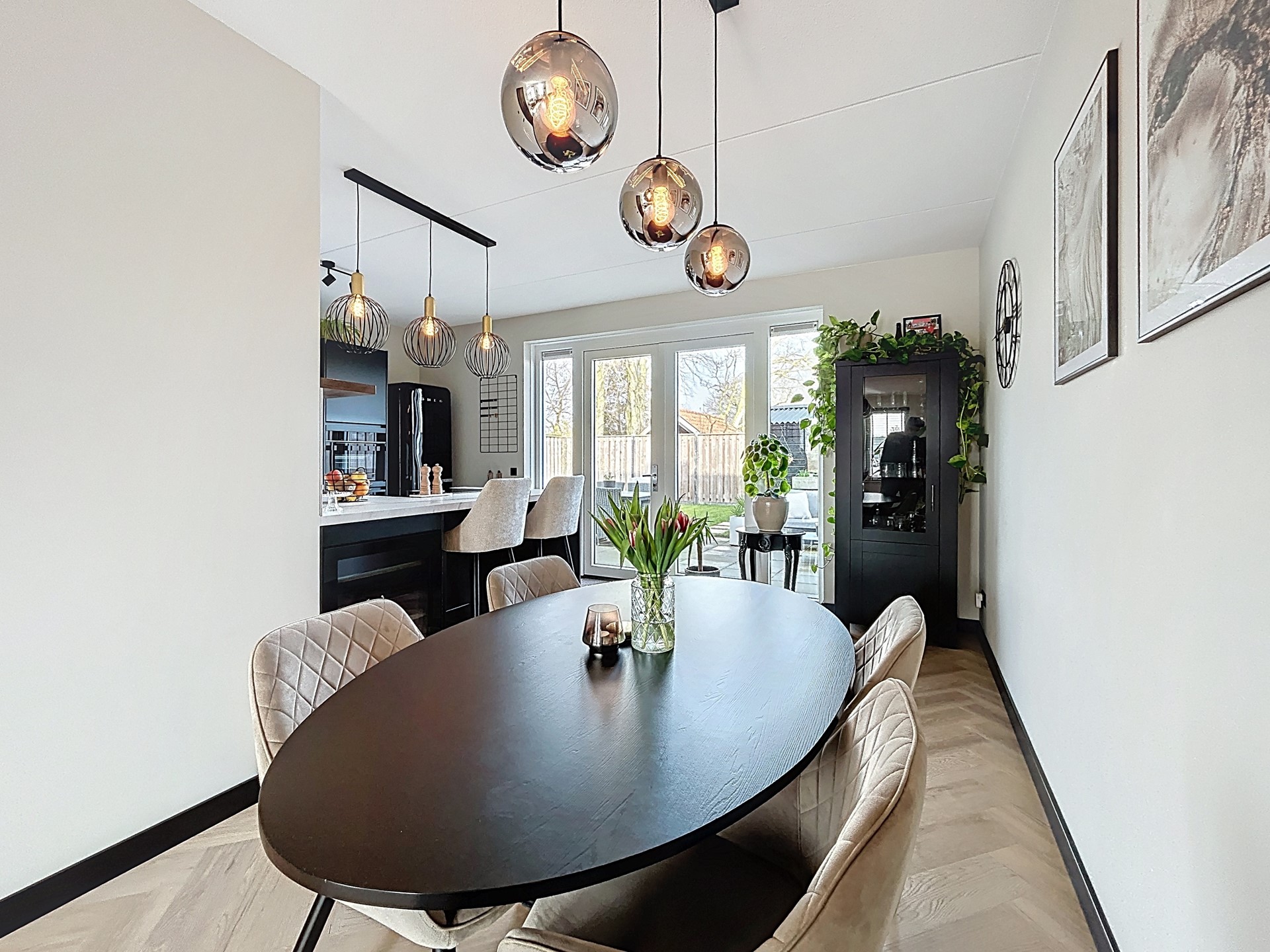 Een groot pluspunt aan deze woning is dat je een vrij uitzicht op de straat hebt. In de straat is voldoende parkeergelegenheid voorzien, waardoor je altijd de auto kan parkeren. De auto parkeer je tevens makkelijk op de eigen oprit. Aan de zijkant wordt middels de antracietgrijze kunststof voordeur de hal betreden met de meterkast, het toilet en de vurenhouten trap met op maat gemaakte trapkast, waar ook een voorraadkast in te vinden is. In de hal heb je alle ruimte voor een garderobe. Vervolgens stap je de woonkamer binnen via de glazen binnendeur met aan de voorkant van de woning de woonkamer met vele raampartijen en aan de achterkant de keuken en eetkamer met openslaande tuindeuren. De begane grond- en verdiepingsvloeren zijn zandcementvloeren van 70 mm dik. Op de begane grond is deze vloer prachtig afgewerkt met een fraaie PVC-visgraat-vloer. De vloeren zijn op beide verdiepingen voorzien van vraaggestuurde vloerverwarming en vloerkoeling en de wanden zijn strak gestuct. Tenslotte is er een uitgebreide luxe keuken in gegaan aan de achterzijde van de woning. Deze keuken is voorzien van een fraai en uitgestrekt blad, een bar, een klimaatkast, een inductiekookplaat met Bora-afzuiging, een vaatwasser, een Quooker en een stoomoven. Daarnaast is er ruimte gemaakt om een losse koelkast te plaatsen.