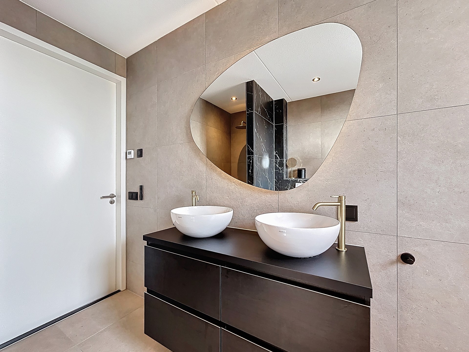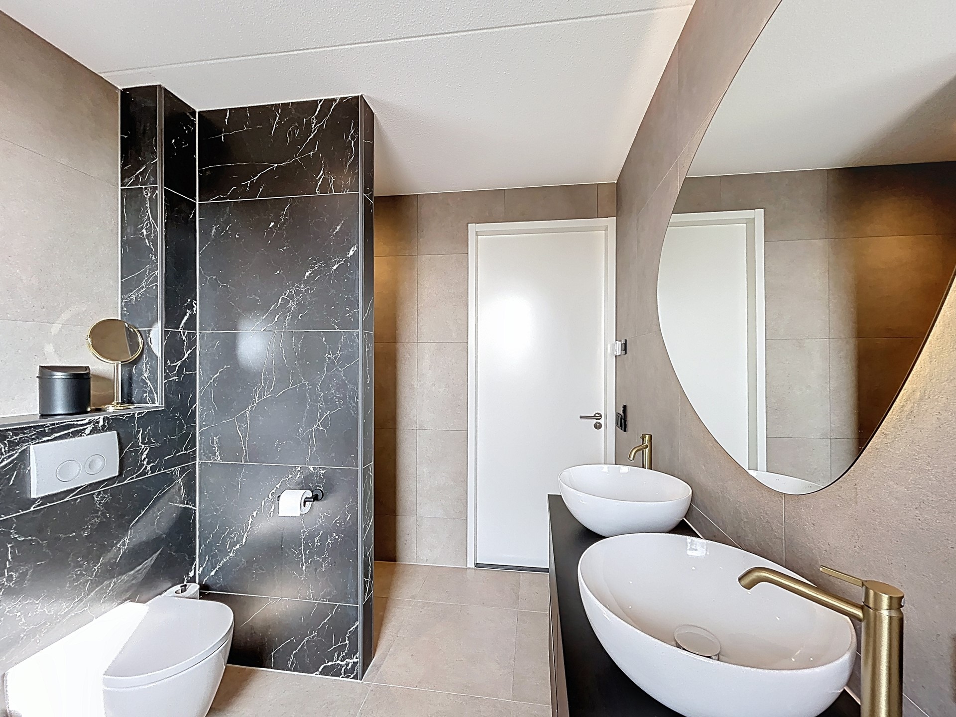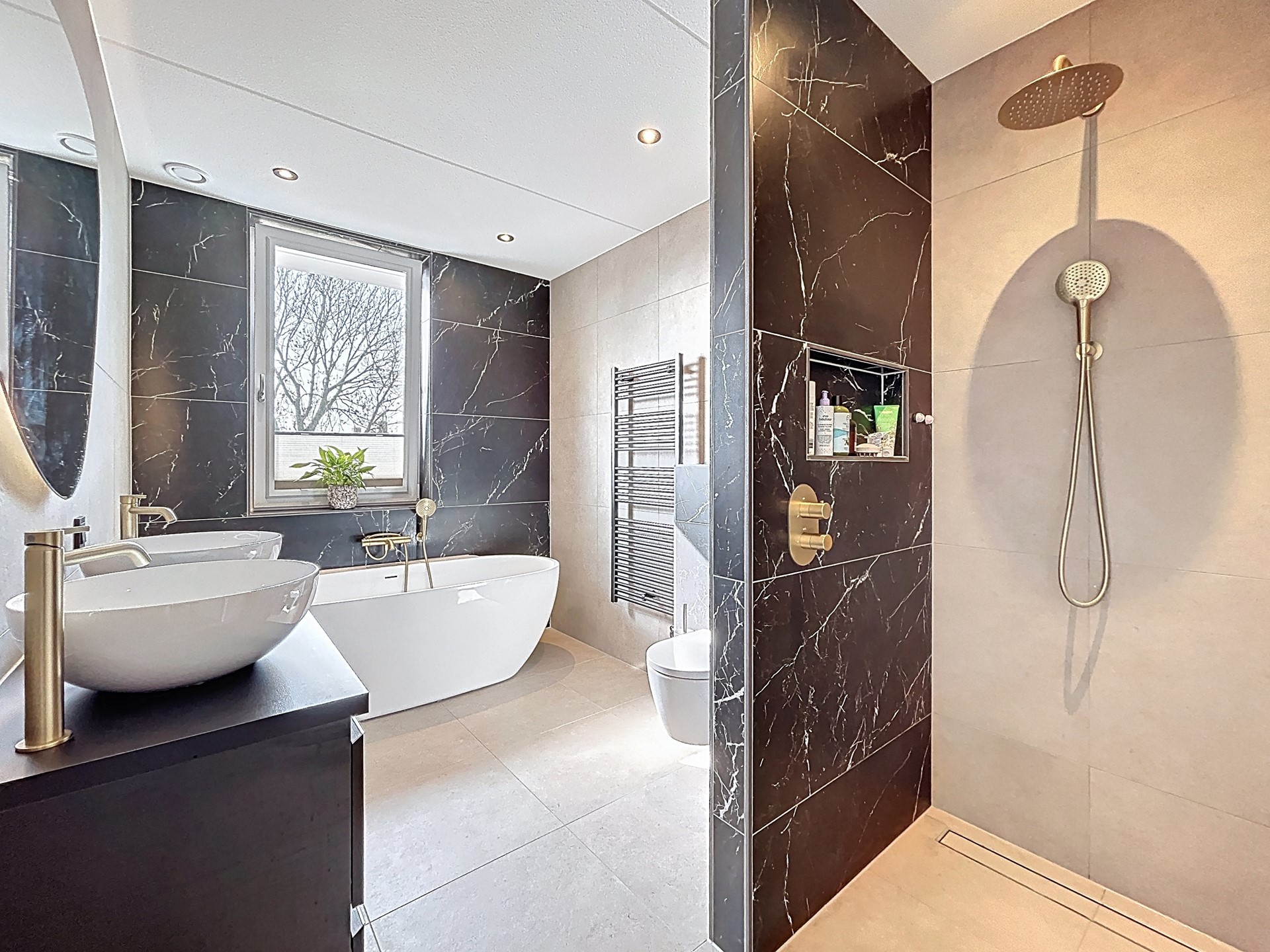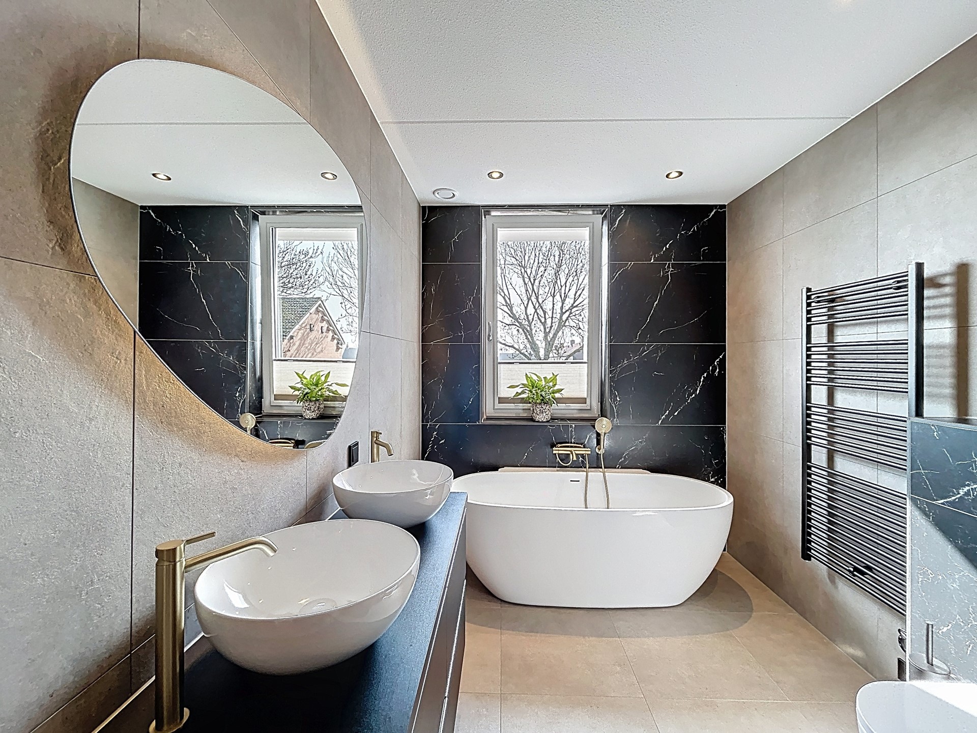 De ruime overloop biedt toegang tot de drie volwaardige slaapkamers, welke allen verrassend ruim zijn. De masterbedroom heeft alle ruimte voor een kingsize tweepersoonsbed en een grote kledingkast. De andere twee slaapkamers zijn leuke kinderkamers met alle ruimte voor een één- of tweepersoonsbed, kledingkast en bureau. Eén van de kamers is nu in gebruik als walk-in-closet, wat een goed beeld geeft van hoe je deze ruimte ook in kunt zetten. Verder is bij de badkamer ook niet op ruimte én luxe bespaard. Deze badkamer is echt met stijl vormgegeven, waarbij de fraaie tegels, de gouden kranen en de inbouwspots de eyecatcher zijn. Het is tevens voorzien van een stijlvol ligbad, een ruime inloopdouche, een toilet en een fraaie dubbele wastafel met designspiegel.