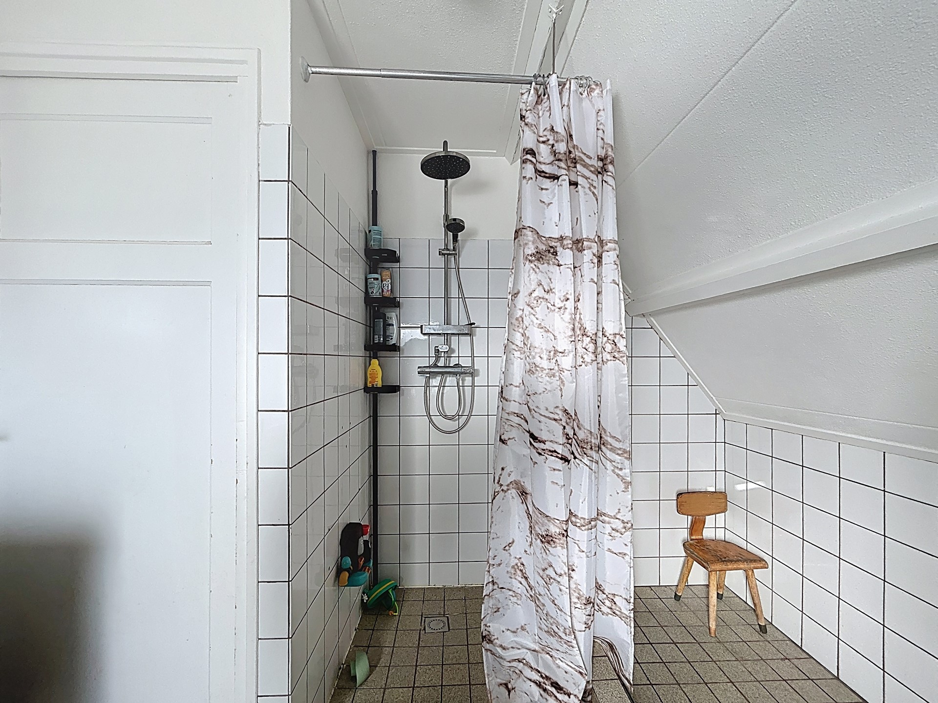 Middels de trap in de hal wordt de overloop van de eerste verdieping betreden. Deze overloop biedt toegang tot de drie slaapkamers en de badkamer. De kamers zijn allen groot genoeg voor een tweepersoonsbed en een kledingkast. De dakkapellen aan de voor en achterkant zorgen voor net de extra ruimte dien je nodig hebt. Tevens is hier de ruime badkamer te vinden met douche en wastafel. Wij zouden adviseren deze aan te passen en daarmee een moderne badkamer te creëren met de toevoeging van een toilet.