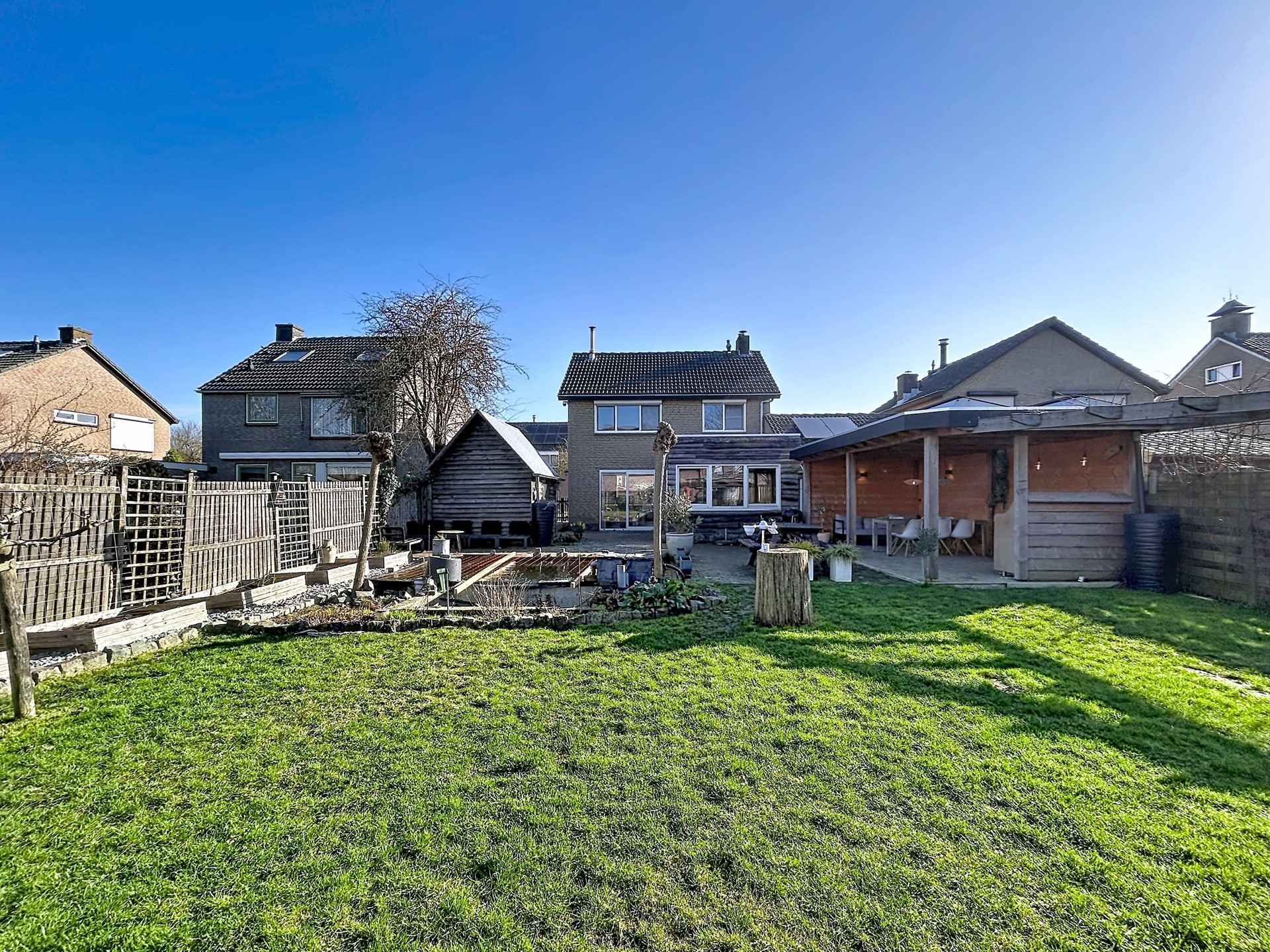 De tuin is rondom de woning gelegen en goed onderhouden. De achtertuin heeft een heerlijke ligging op het westen, waardoor je van de middag tot laat in de avond kan genieten van de zon. In 2023 is de vijver aangelegd en de overkapping geplaatst. Met deze overkapping nodig je graag je vrienden en familie uit voor een barbecue. Aansluitend is zelfs een buitendouche geplaatst. Via het heuse grasveld lopen we naar de achterzijde waar je nog een leuke kippenren/-hok hebt. Leuk voor de kinderen die altijd al kippen of konijntjes hebben willen hebben. Verder is er nog een houten voorraadschuur van 10 m² voorzien.
