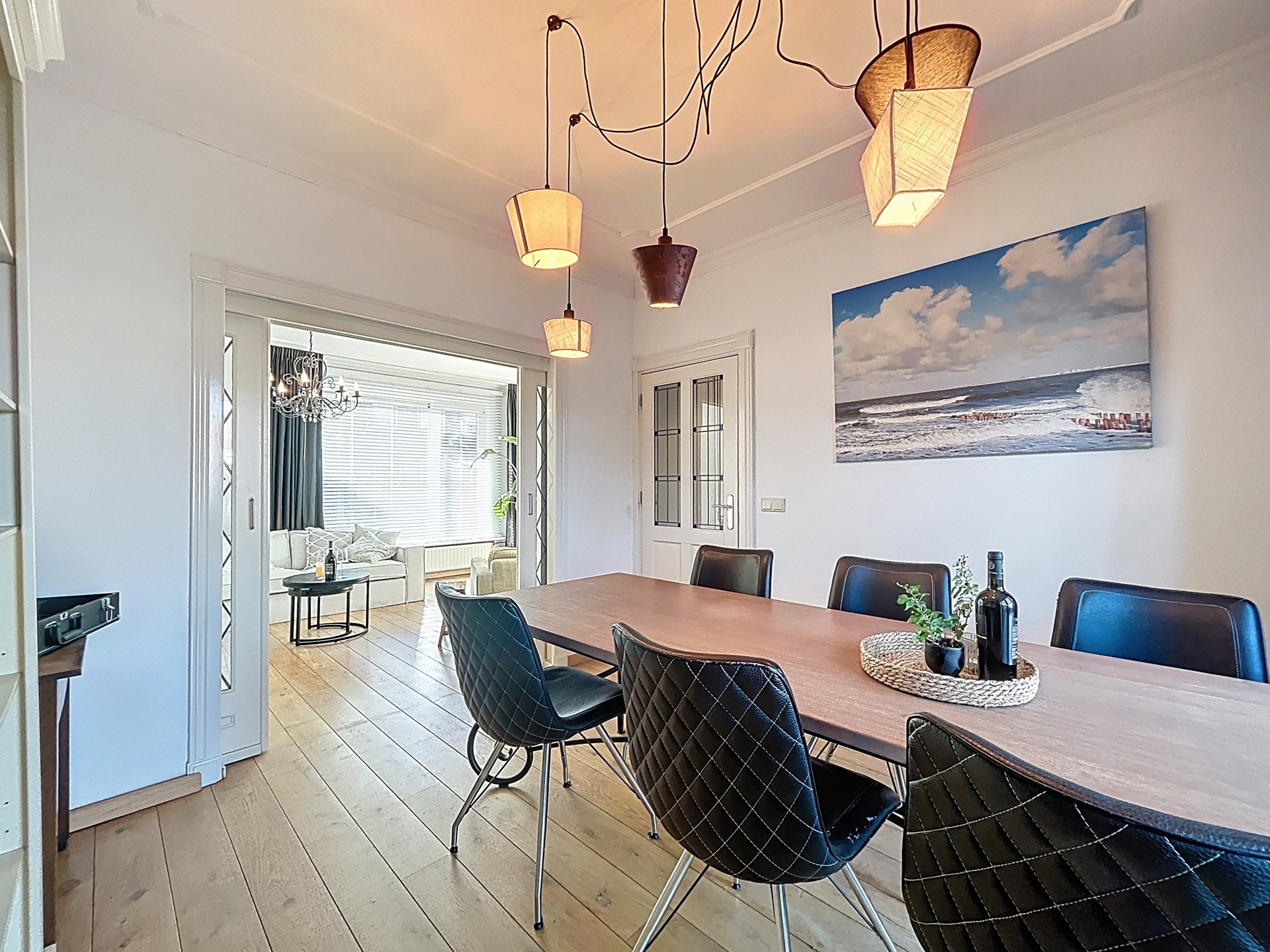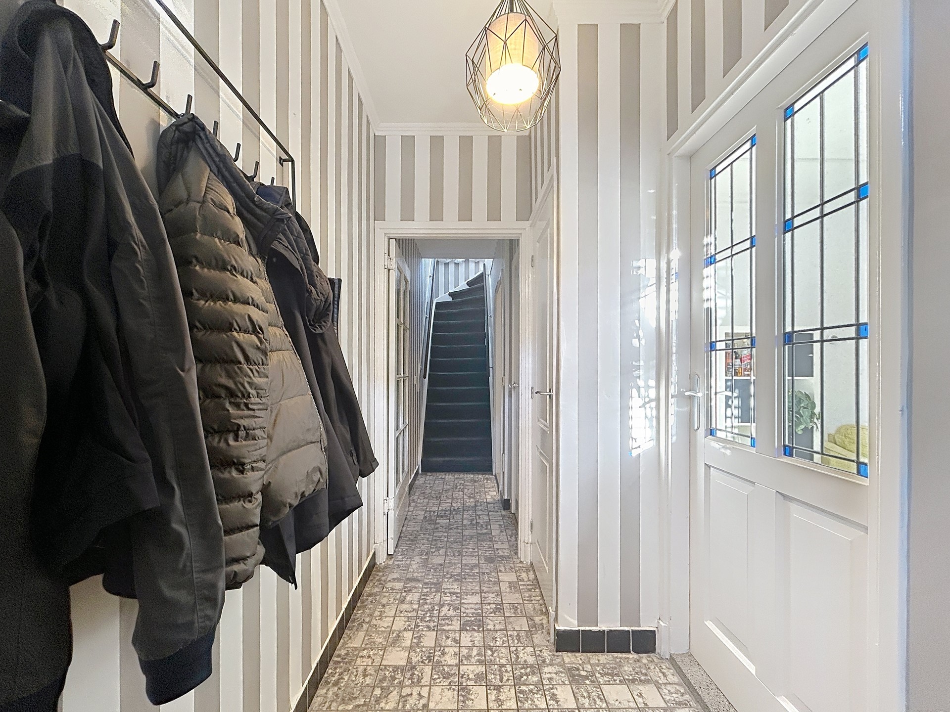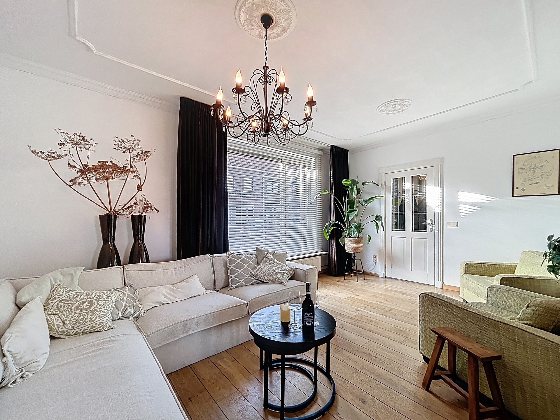 Betreedt de woning via de voordeur om de rondleiding in de hal te starten. Deze hal biedt plaats voor een garderobehoek, een meterkast en een voorraadkast. Het biedt toegang tot de woonkamer en de aparte keuken. Middels de tussendeur met glas-in-lood wordt de woonkamer aan de voorzijde van de woning betreden. Hier valt ook direct de prachtige afwerking op met de parketvloer en de ornamentenplafonds. Deze voorkamer biedt alle ruimte voor een gezellige zithoek. Middels de en-suite deuren wordt de eetkamer betreden. Hier is de afwerking net zo goed en heb je alle ruimte voor een 6-persoons eettafel. De convectorput zorgt dat de warmte binnen blijft en de openslaande tuindeuren verwelkomen je tot de tuin. Ook via de eetkamer wordt de keuken betreden. Deze keuken is voorzien van diverse appartement, zoals een fraaie ingebouwde koelkast, een vaatwasser, een oven en een losse inductie kookplaat met afzuigkap. Aansluitend wordt de bijkeuken betreden met de witgoedaansluitingen en tevens toegang tot de tuin. Tenslotte is hier ook het ruime toilet te vinden.