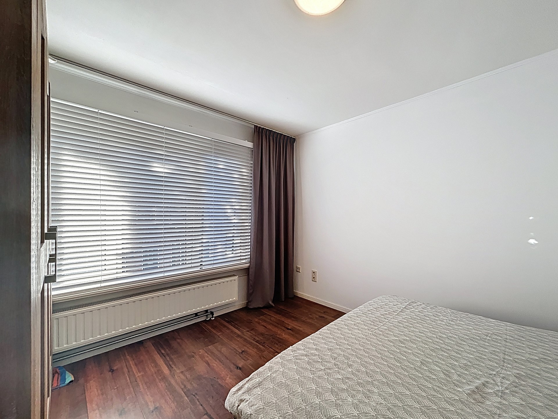 De overloop van de eerste verdieping wordt betreden middels de trap in de gang. Hier komen we uit op de royale overloop die toegang geeft tot de drie slaapkamers, de badkamer en het aparte toilet. De badkamer is voorzien van een wastafel en douche. De drie slaapkamers zijn elk groot genoeg voor een tweepersoonsbed en een kledingkast/bureau. Fijn is ook dat deze slaapkamers allemaal te verduisteren zijn middels rolluiken.