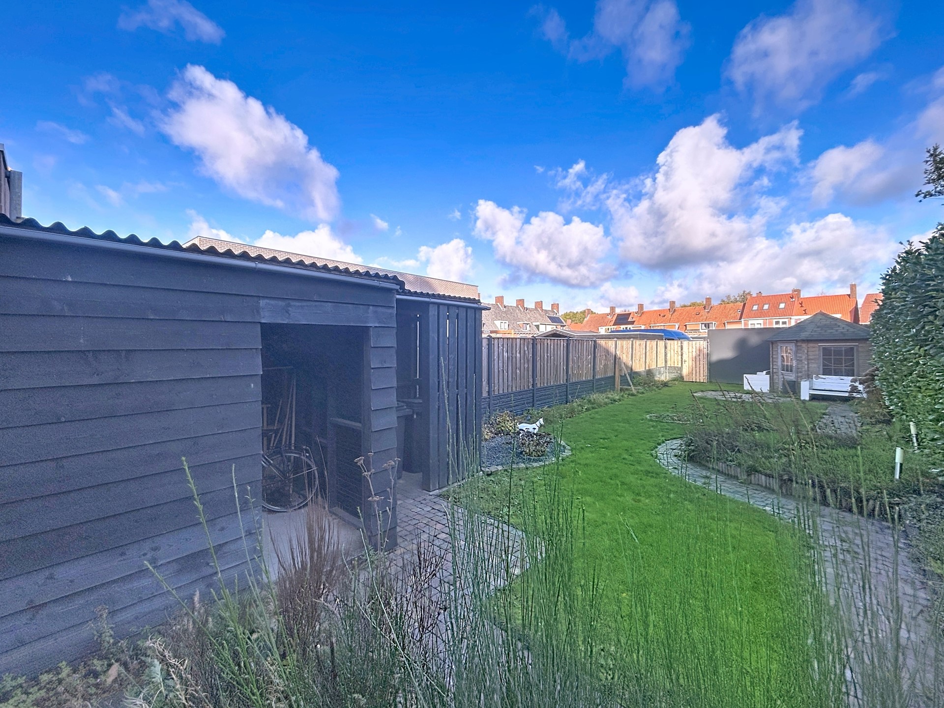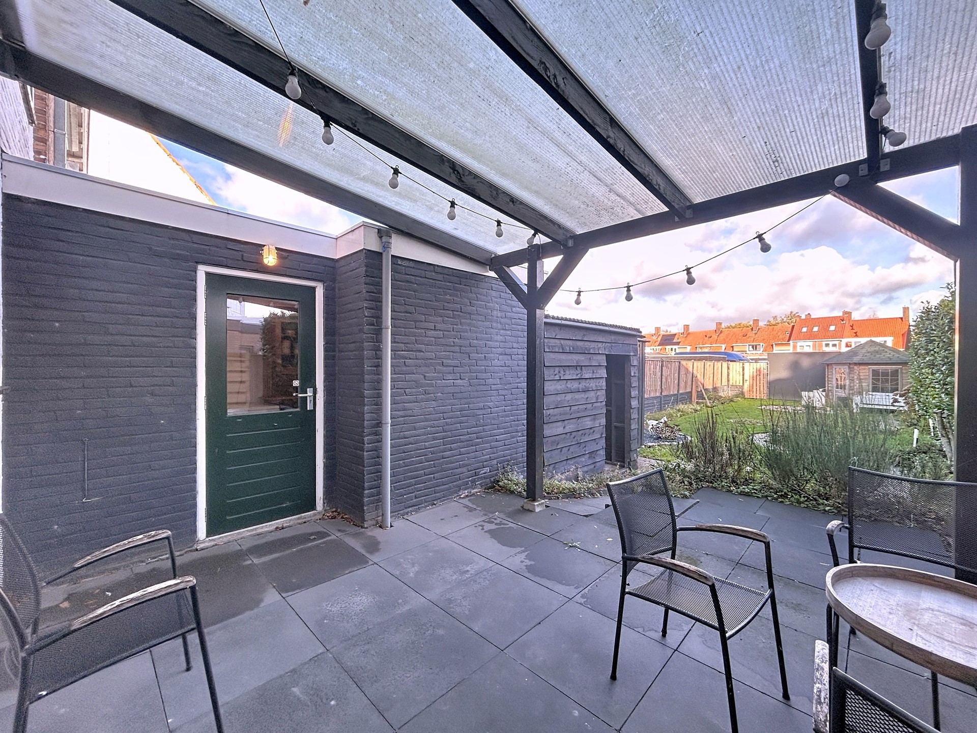 De achtertuin is op het noordwesten gelegen en vanwege zijn 25 meter diepte heb je toch een groot deel van de dag de zon. De veranda aan de woning zorgt voor een gezellige buitenplaats met bijvoorbeeld een loungeset. Achter de aanbouw is een berging voorzien en achter op het perceel treffen we een tuinhuis voor het tuinmateriaal. Via de gang langs de woning is de straat te bereiken en via de poort aan de achterzijde komen we uit bij de garageboxen. Hier is nog een garagebox die bij de woning hoort van 18 m² met eigen meterkast.