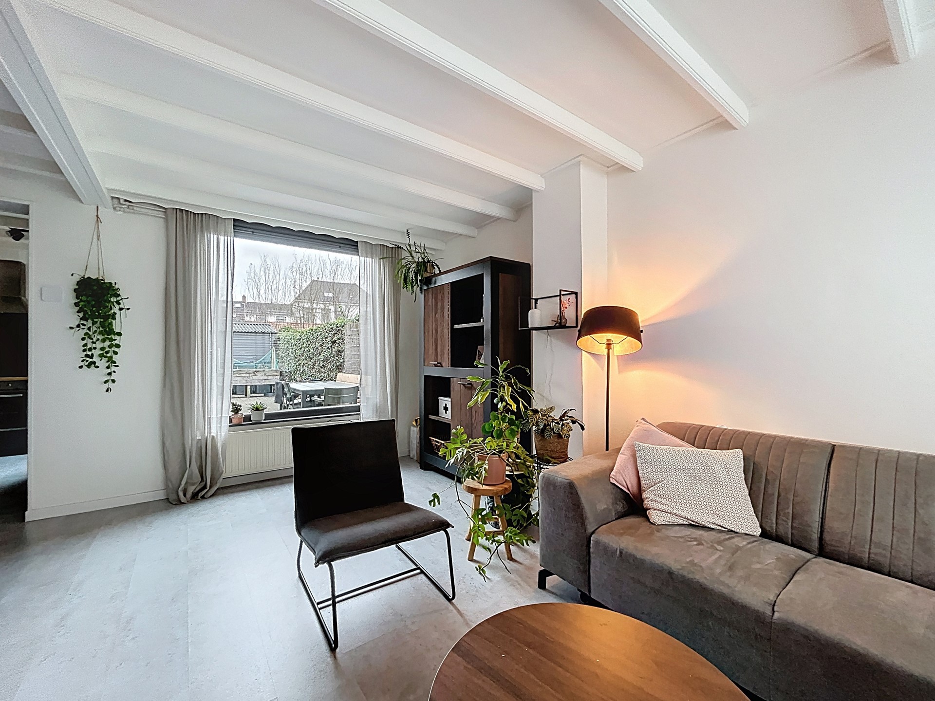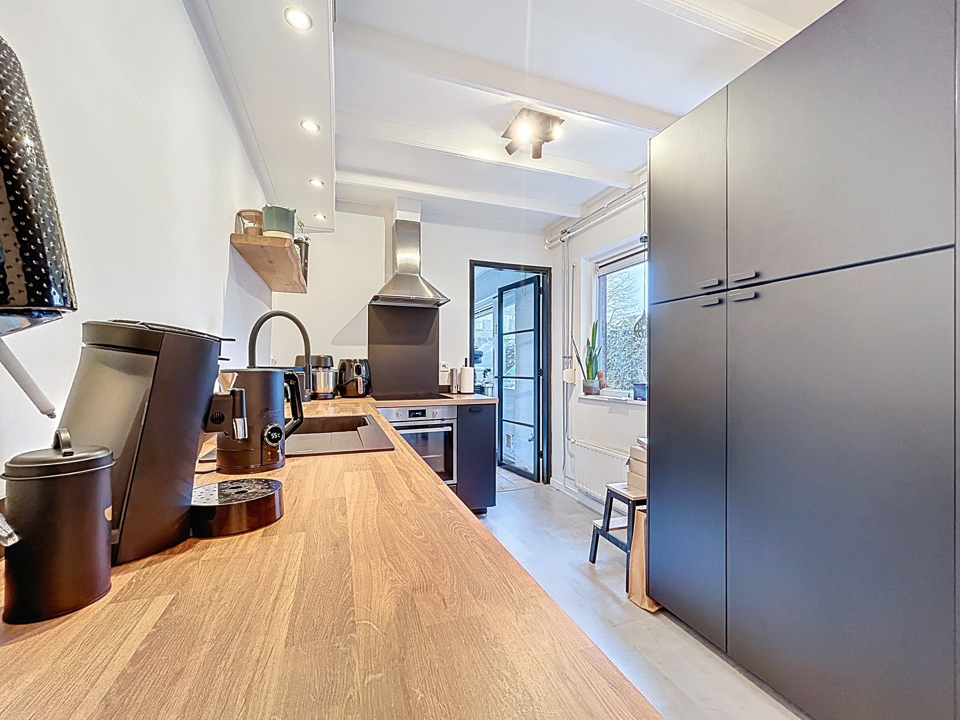 Via de nette onderhoudsvriendelijke voortuin wordt middels de houten voordeur de hal betreden. Deze hal biedt plaats voor het toilet met fonteintje, de (vernieuwde) meterkast, de trap en de trapkast. Lopen we verder, dan betreden we de L-vormige woonkamer. Hier is goed zichtbaar wat een sfeer er in de woning zit met het fraaie schilderwerk, dan houten balken en de nette vloeren. Je hebt er genoeg ruimte voor een gezellige zithoek en een eettafel. Vervolgens betreden we, via de open doorgang in de aanbouw, de keuken. Deze is in 2020 geplaatst en voorzien van een vaatwasmachine, oven, koelkast, inductie kookplaat en afzuigkap. Aansluitend treffen we tenslotte de bijkeuken met de witgoedvoorzieningen, de CV-ketel en de kastenwand. Tevens wordt langs hier de achtertuin betreden.