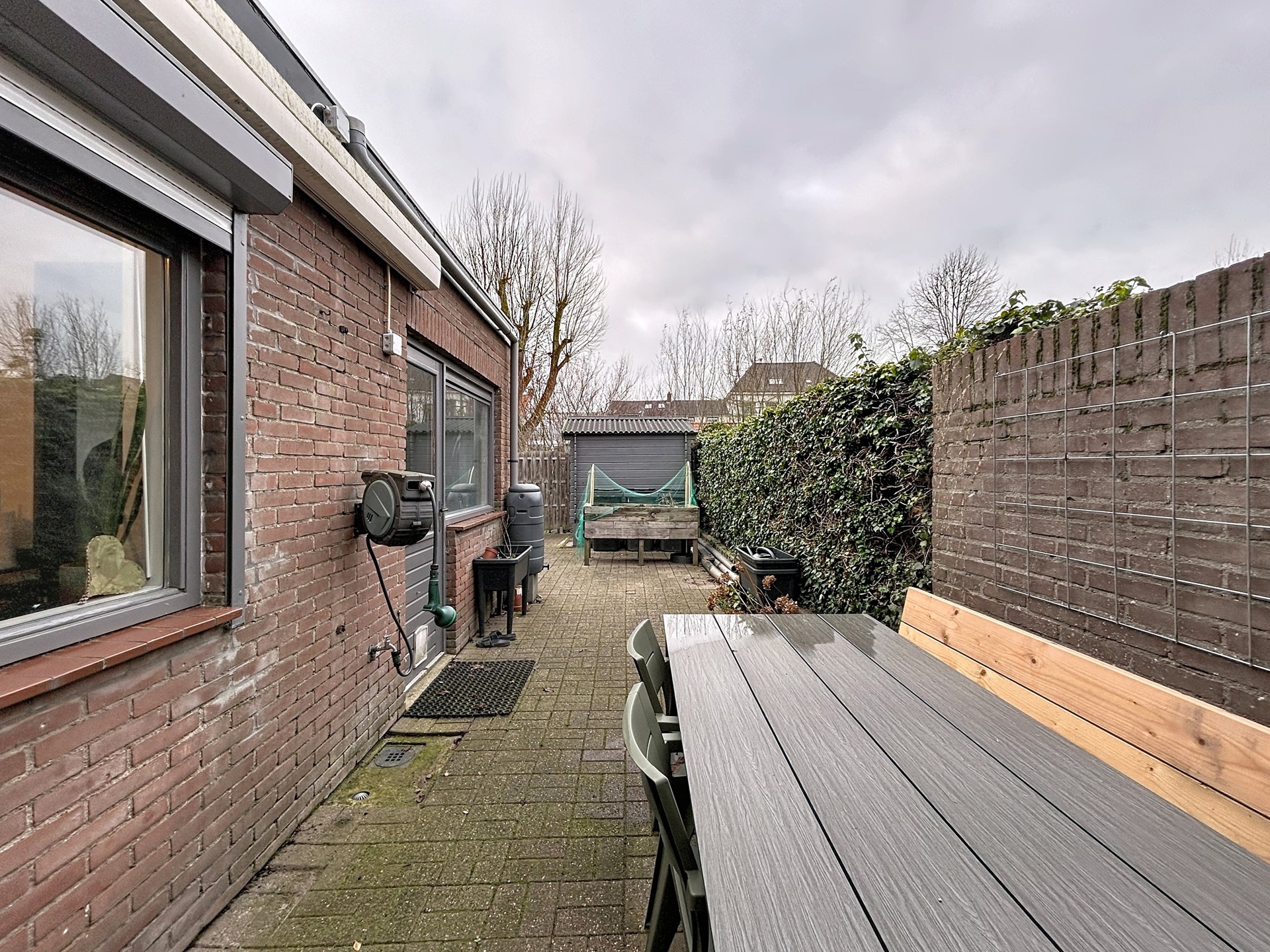 De tuin heeft een ligging op het westen, waardoor je tot laat in de avond van de zon kan genieten. Het is een diepe onderhoudsvriendelijke tuin met achterom en een tuinhuis. Het zonnescherm aan de aanbouw zorgt voor verkoeling in de zomer.