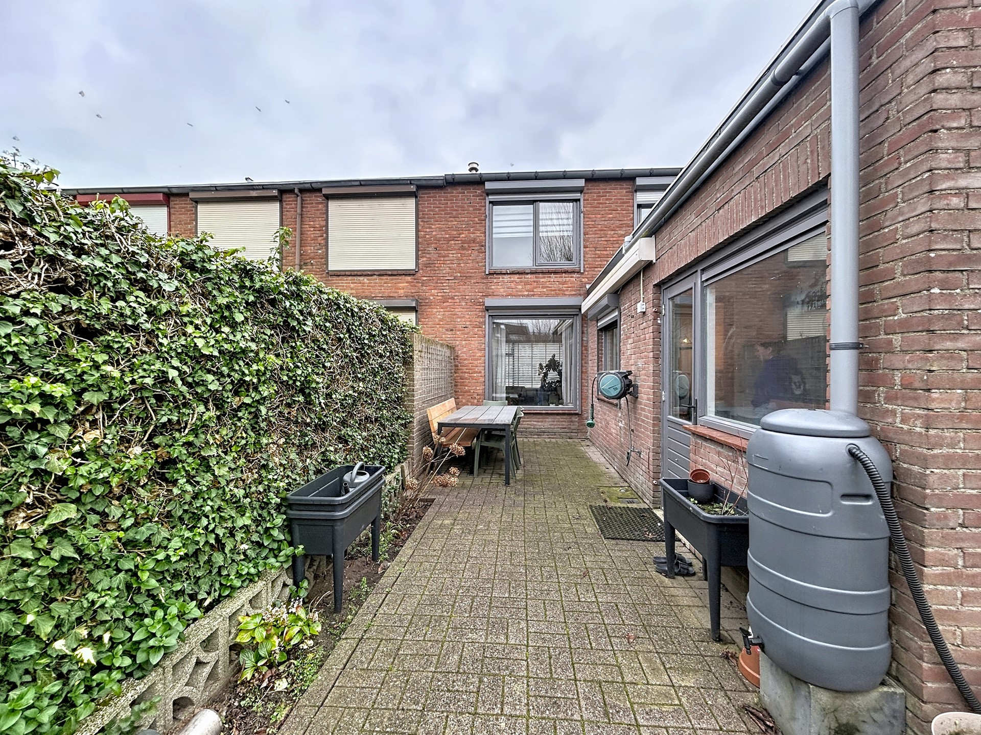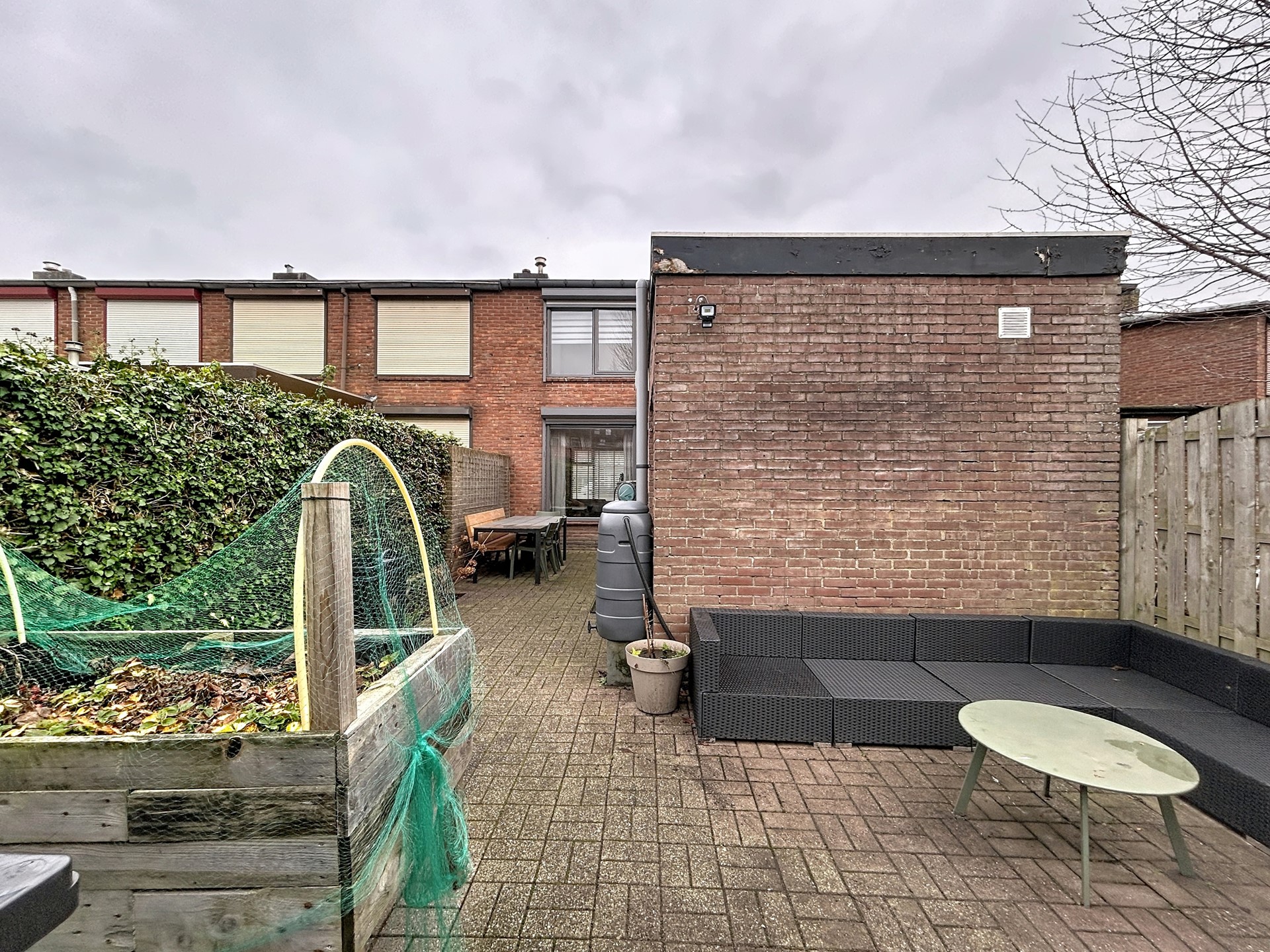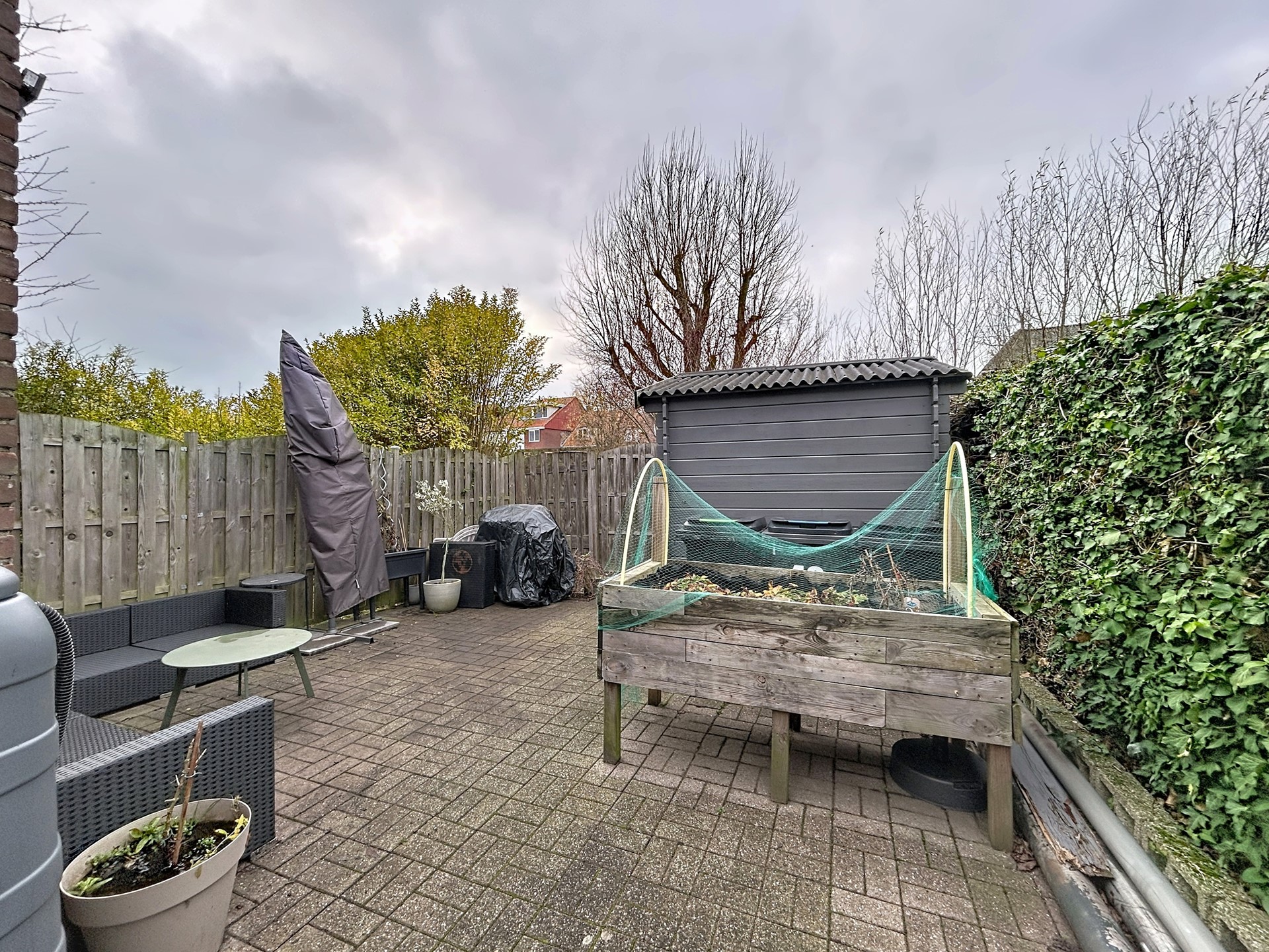 - Achtertuin op het westen met een zonnescherm aan de gevel.