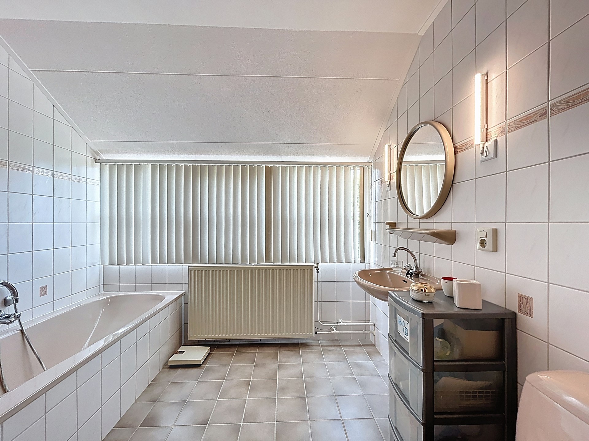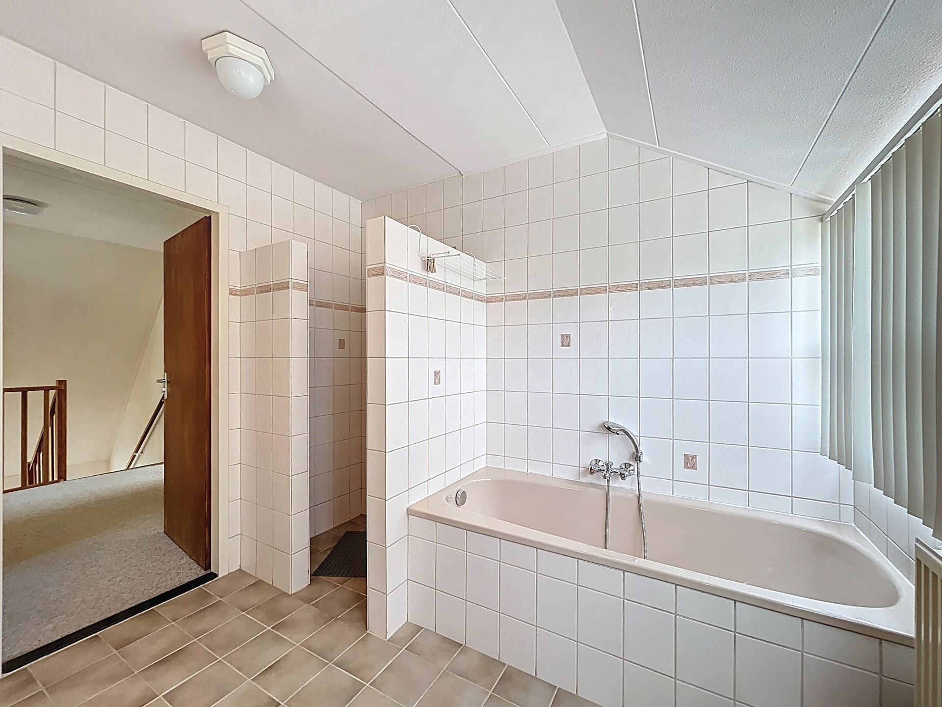 Vanuit de entree betreden we de ruime overloop met vide. Op deze verdieping bevinden zich vier slaapkamers: twee ruime kamers geschikt voor een tweepersoonsbed en twee kamers die perfect zijn als kinderkamer of hobbyruimte. De badkamer is voorzien van een ligbad, douche, toilet en wastafel met meubel.
