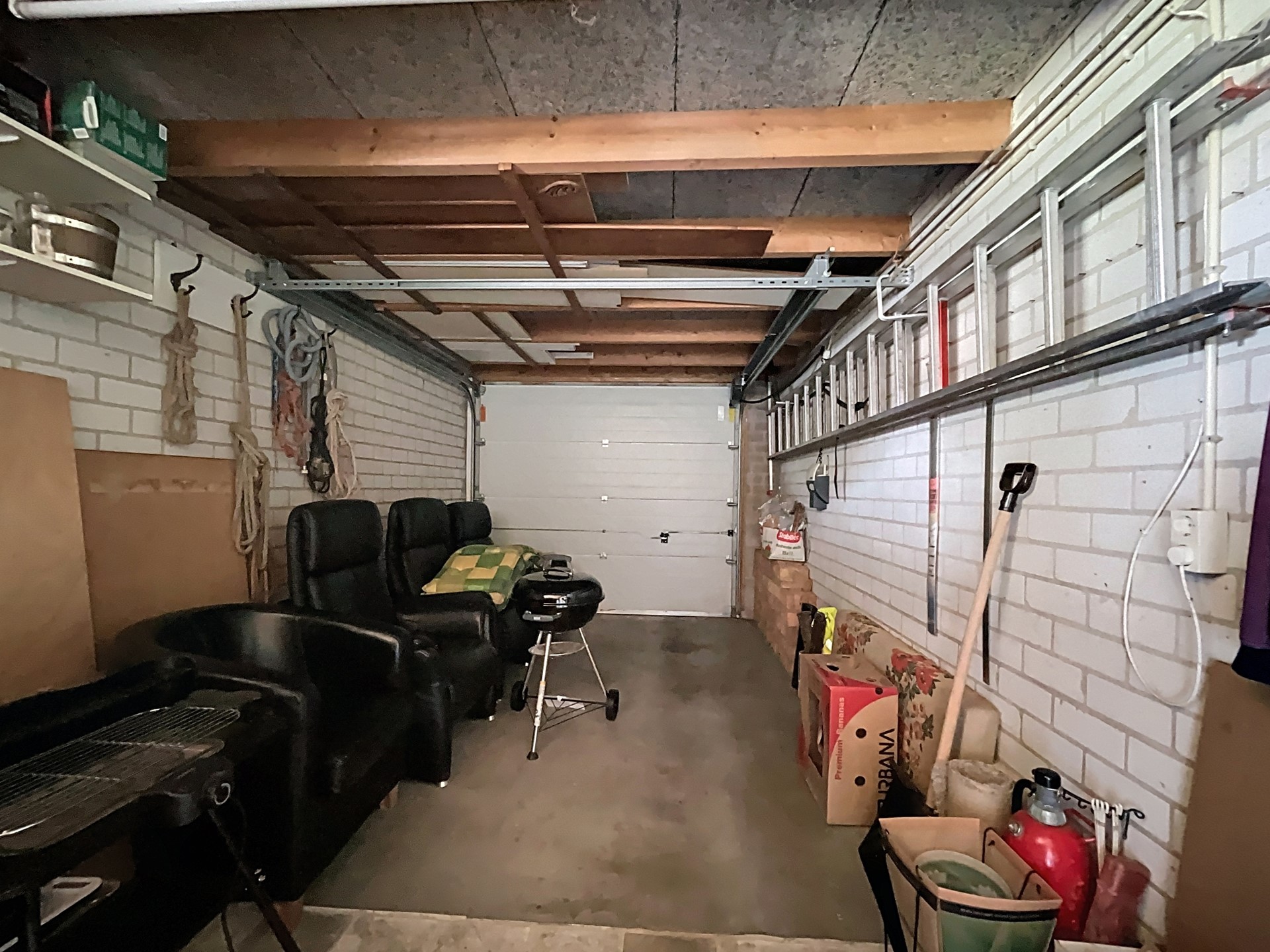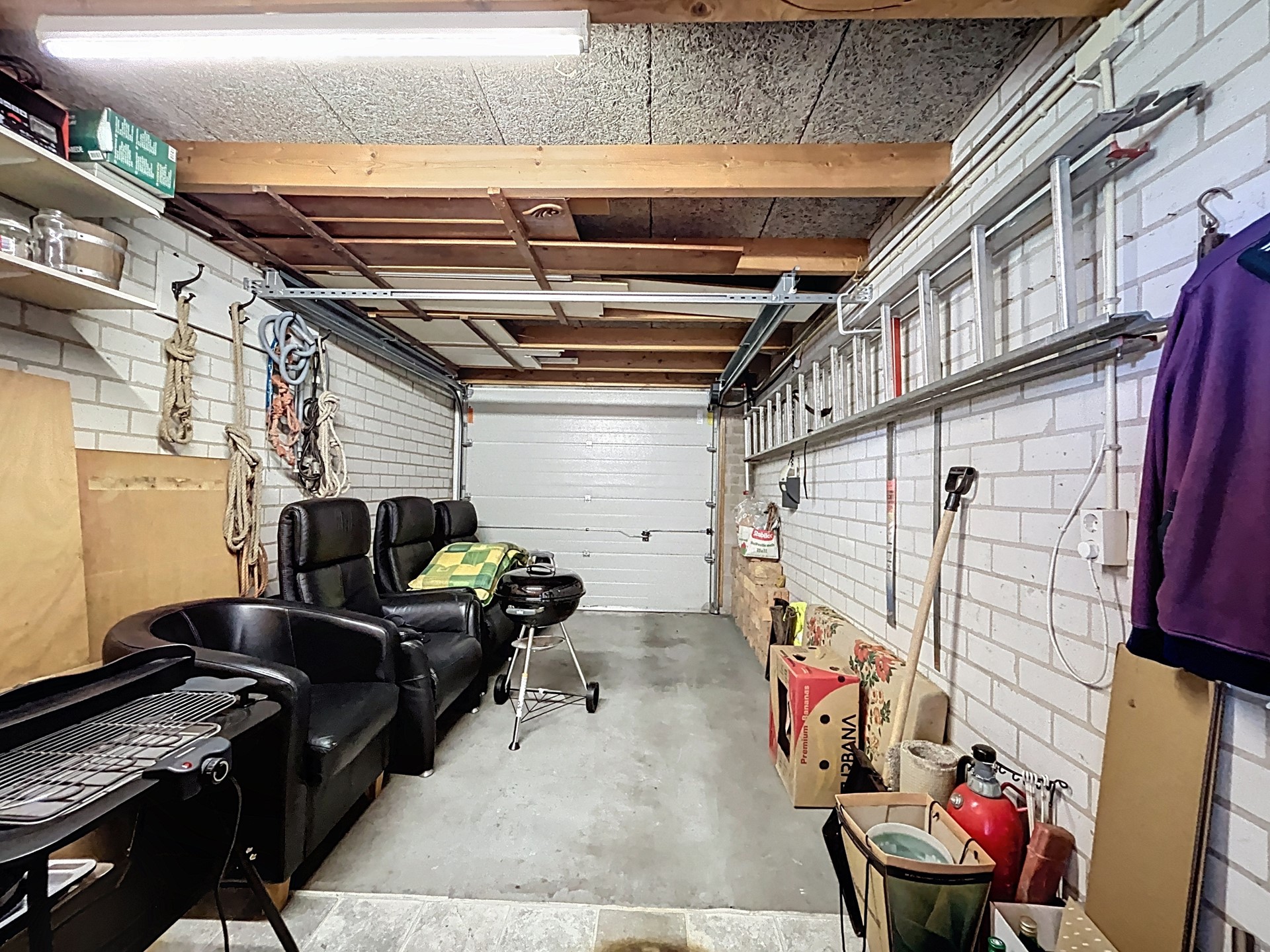 De garage met oprit biedt ruimte voor één auto en extra opbergruimte.