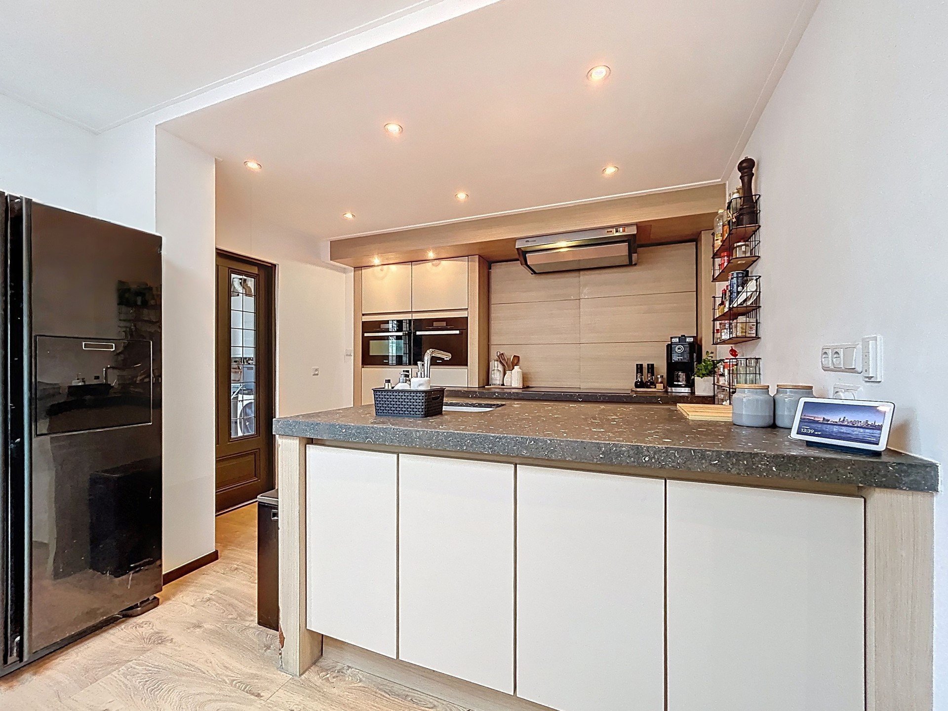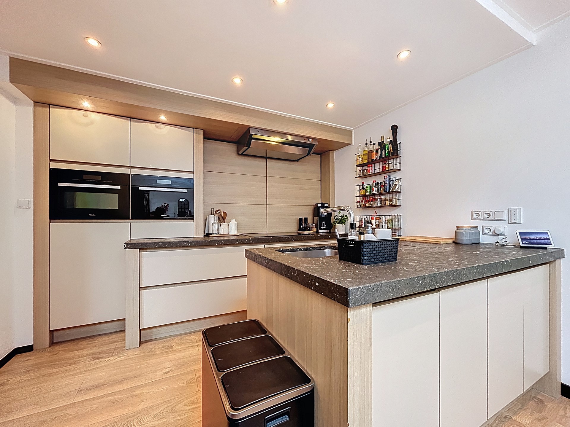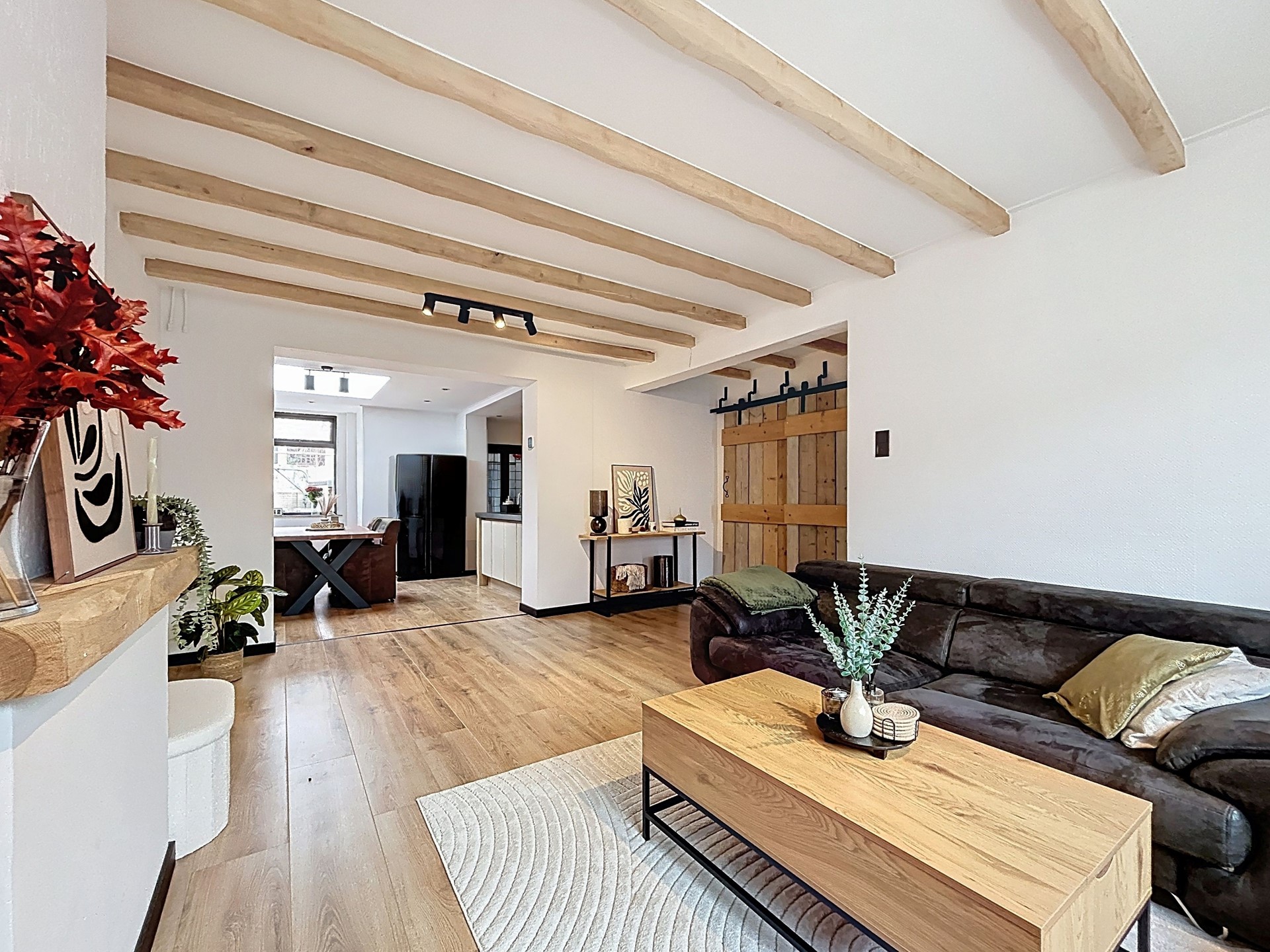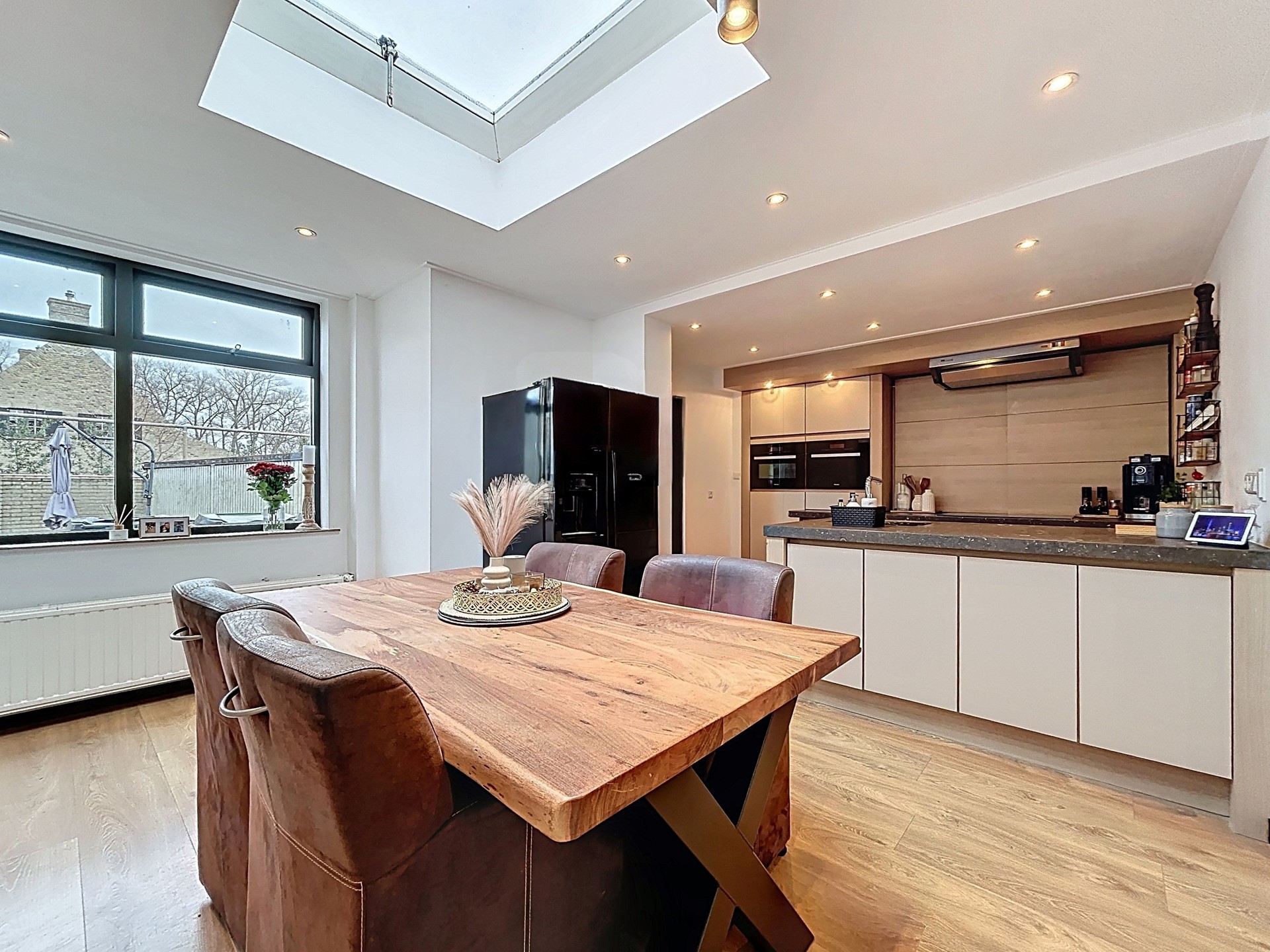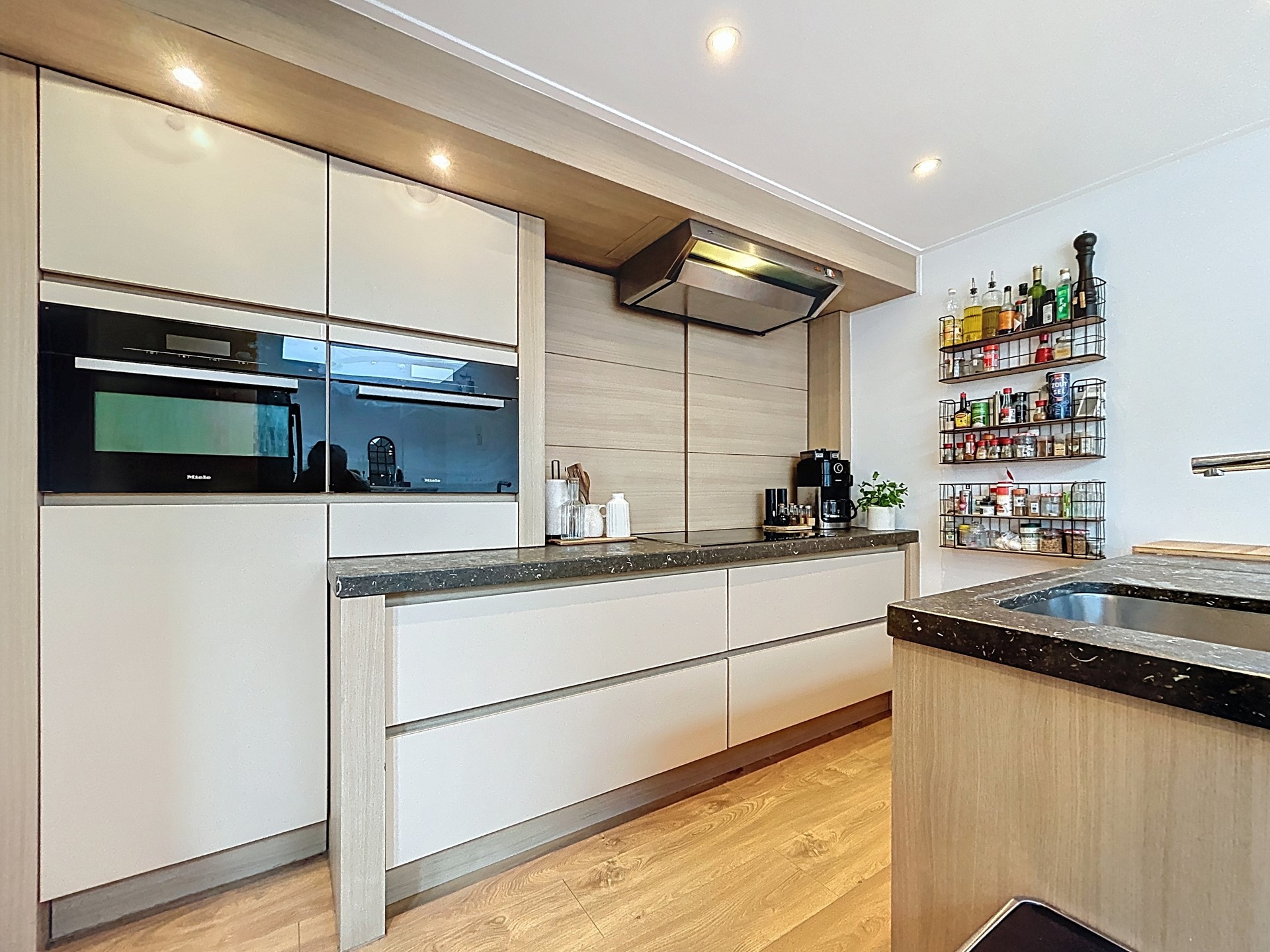 Middels de voordeur wordt de hal met het toilet, de trapkast en de meterkast betreden. De nieuw beklede trap biedt hier tevens toegang tot de verdieping. De meterkast is tevens recent uitgebreid. Vervolgens lopen we verder de woonkamer in en verbaas je hier over de ruimte die de woning te bieden heeft. Allereerst treffen we aan de rechter zijde een handige inbouwkast. Vervolgens heb je aan de voorzijde ruime zithoek en dankzij de aanbouw kan je aan de achterzijde een lange eettafel kwijt. De grote raampartijen en het dakraam zorgen voor genoeg lichtinval in de woning. Daarnaast zijn de muren en het plafond recent nog geschilderd en is de vloer (inclusief isolatiematten) nieuw gelegd. Het karakter wordt verkregen dankzij de fraaie balken en de haard. De inbouwspots in de aanbouw zorgen voor de final touch. In de aanbouw is tevens de keuken te vinden, deze is in 2019 geplaatst. De handige opstelling hiervan zorgt voor veel werkruimte en middels een kleine aanpassing de mogelijkheid om barkrukken aan te plaatsen voor het ontbijt. Nu is er extra opslagruimte gecreëerd en biedt de keuken verder veel kwaliteit met het natuurstenen blad en de inwerking in de muur. Let vooral ook op de kastenwand achter het kookgedeelte. Het is voorzien van Miele-apparaten zoals de combi-oven en stoomoven, inductie kookplaat, afzuigkap en vaatwasser. Tenslotte betreden we de bijkeuken. Ook deze is weer verrassend ruim en biedt genoeg plaats voor een wasmachine, droger en koel-/vrieskast. De huidige Amerikaanse koelkast is over te nemen. De CV-ketel hier is eind 2025 zelfs nog vernieuwd! Dit is de enige ruimte met een kozijn met enkel glas en langs hier wordt tevens de tuin betreden.
