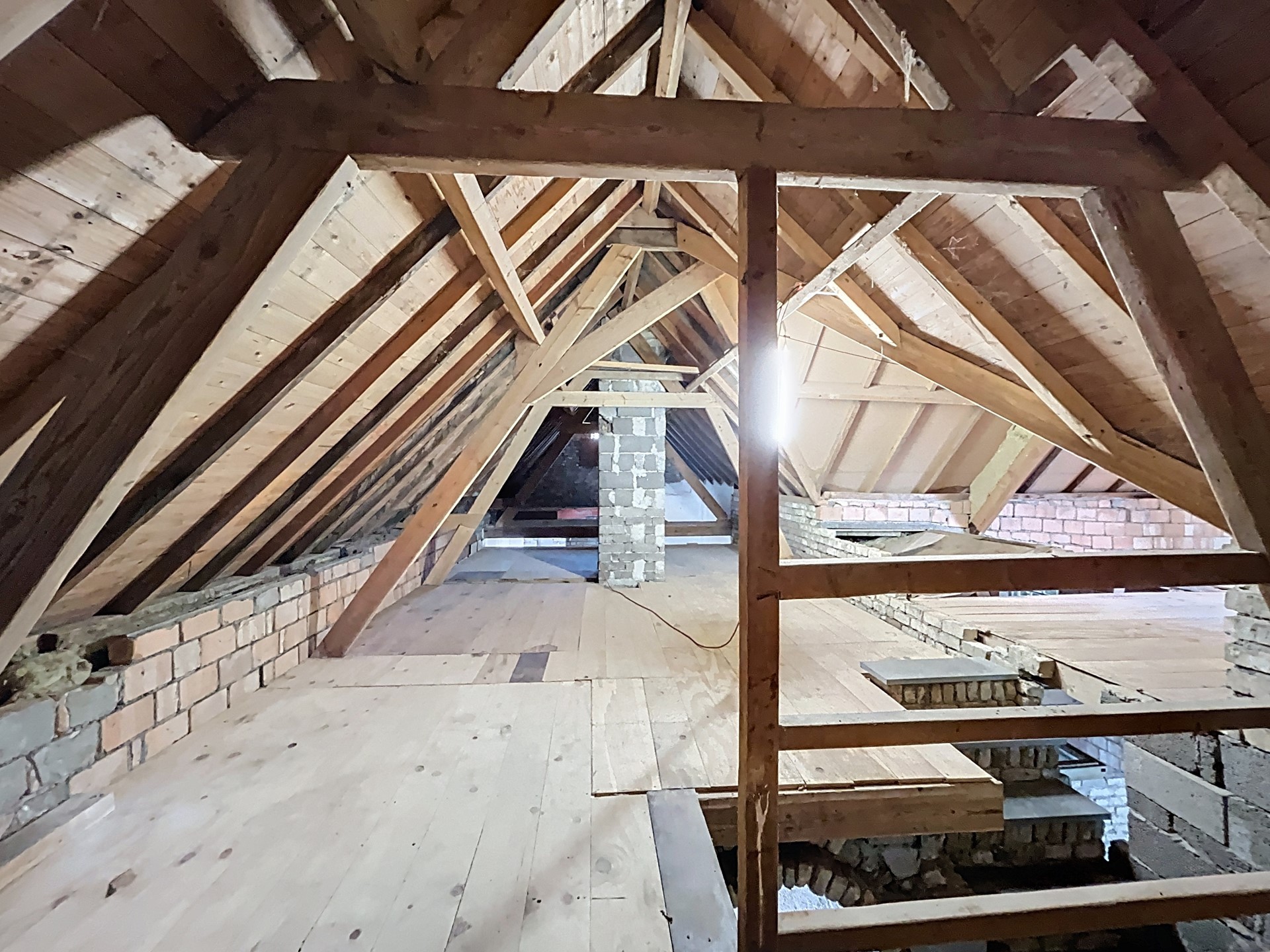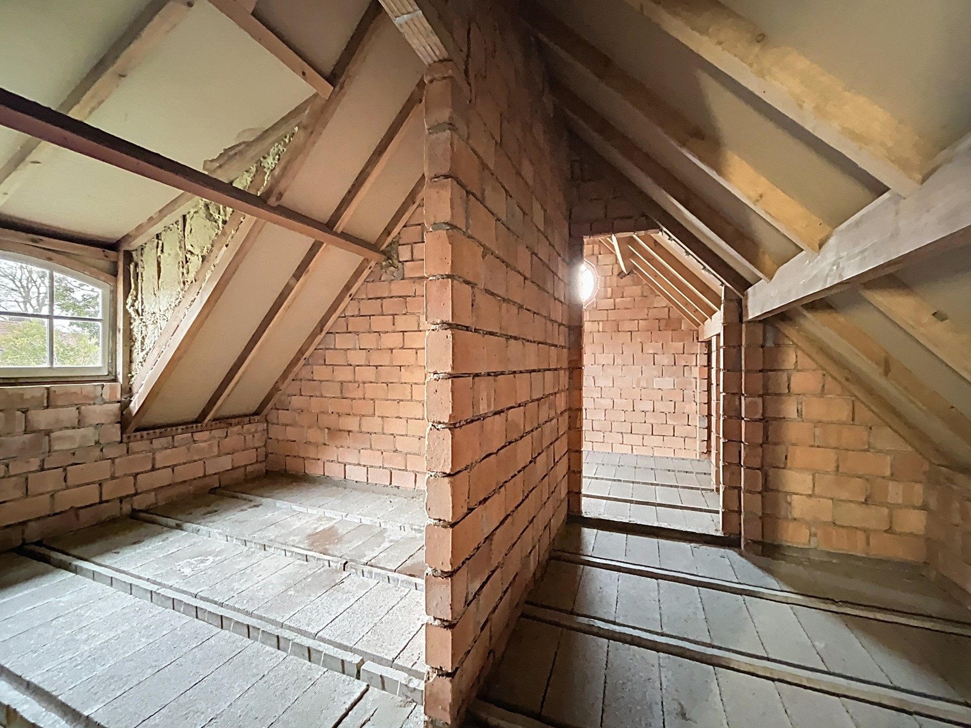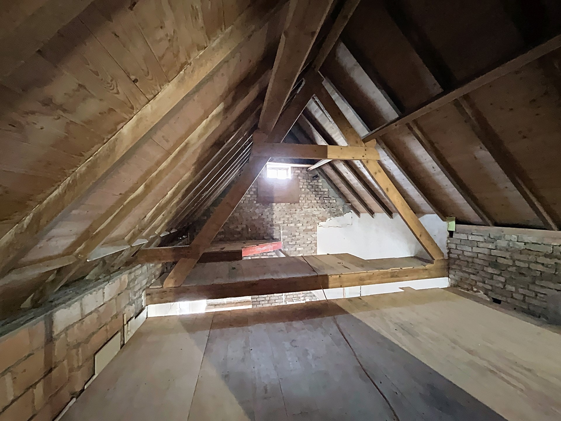 De verdieping kan dus via twee zijdes betreden worden. Dit geeft mogelijkheden. Nu is het een grote open zolder met twee aparte slaapkamers. Door tussenwanden te plaatsen zijn hier makkelijk drie extra slaapkamers te creëren. De drie dakkapellen brengen licht en ruimte binnen en het dak is geïsoleerd.