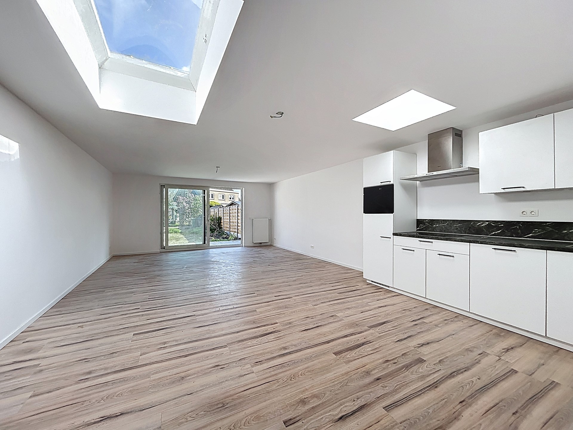 De woonkamer met open keuken is heerlijk ruim en licht dankzij de grote raampartijen en lichtkoepels. De moderne keuken is strak uitgevoerd en van alle gemakken voorzien. Hier kook je met plezier terwijl je contact houdt met de rest van de ruimte.