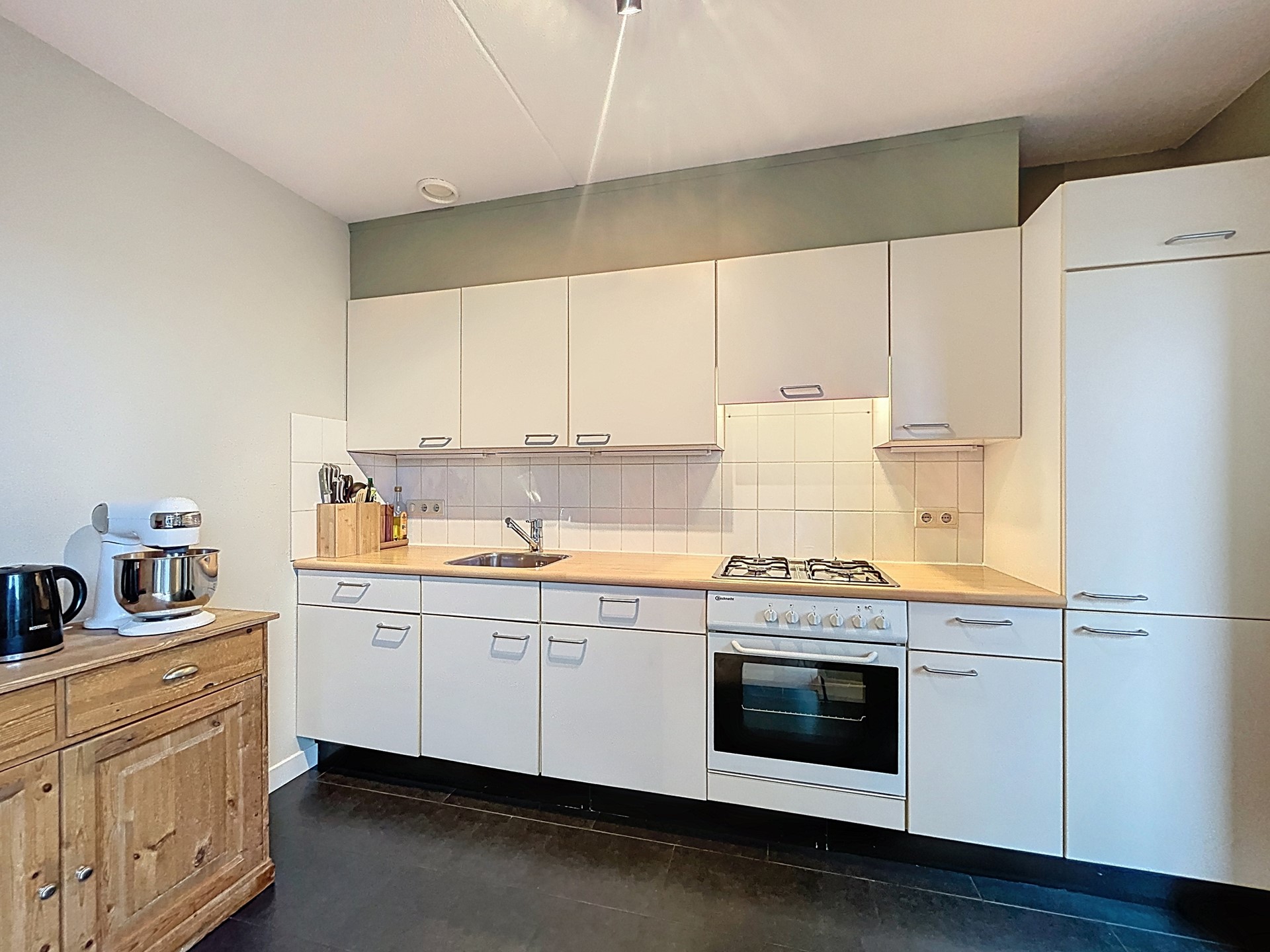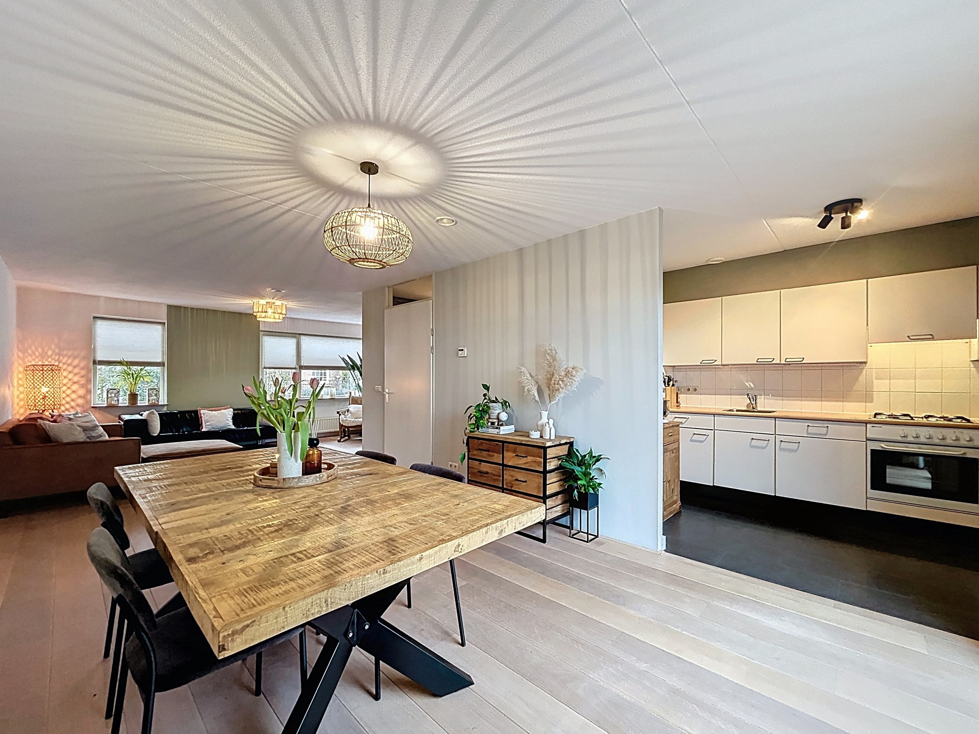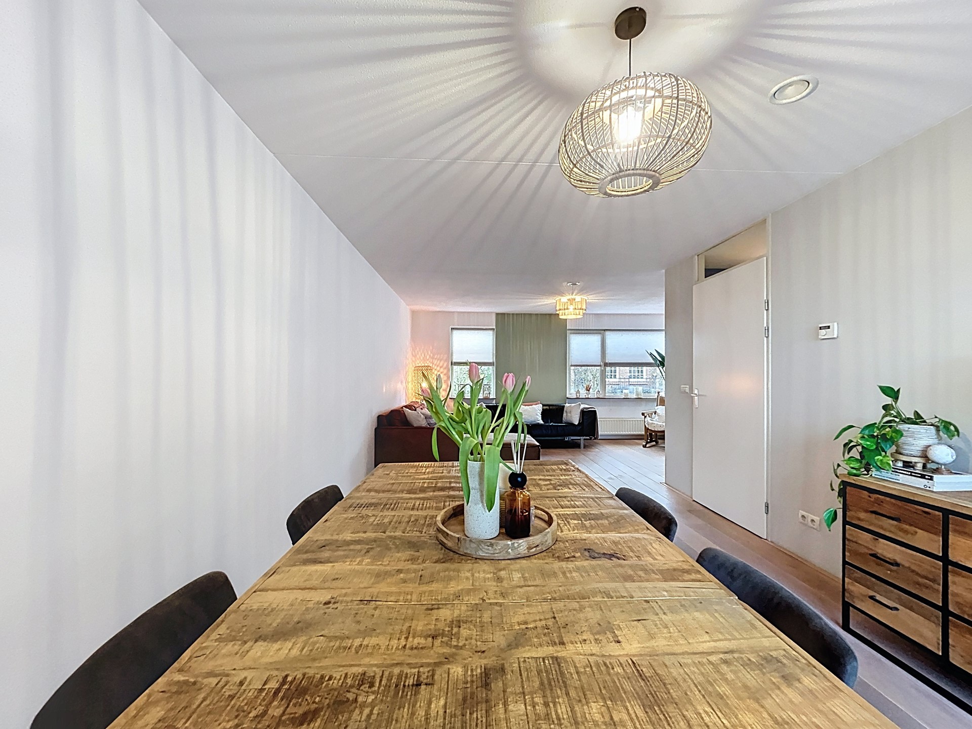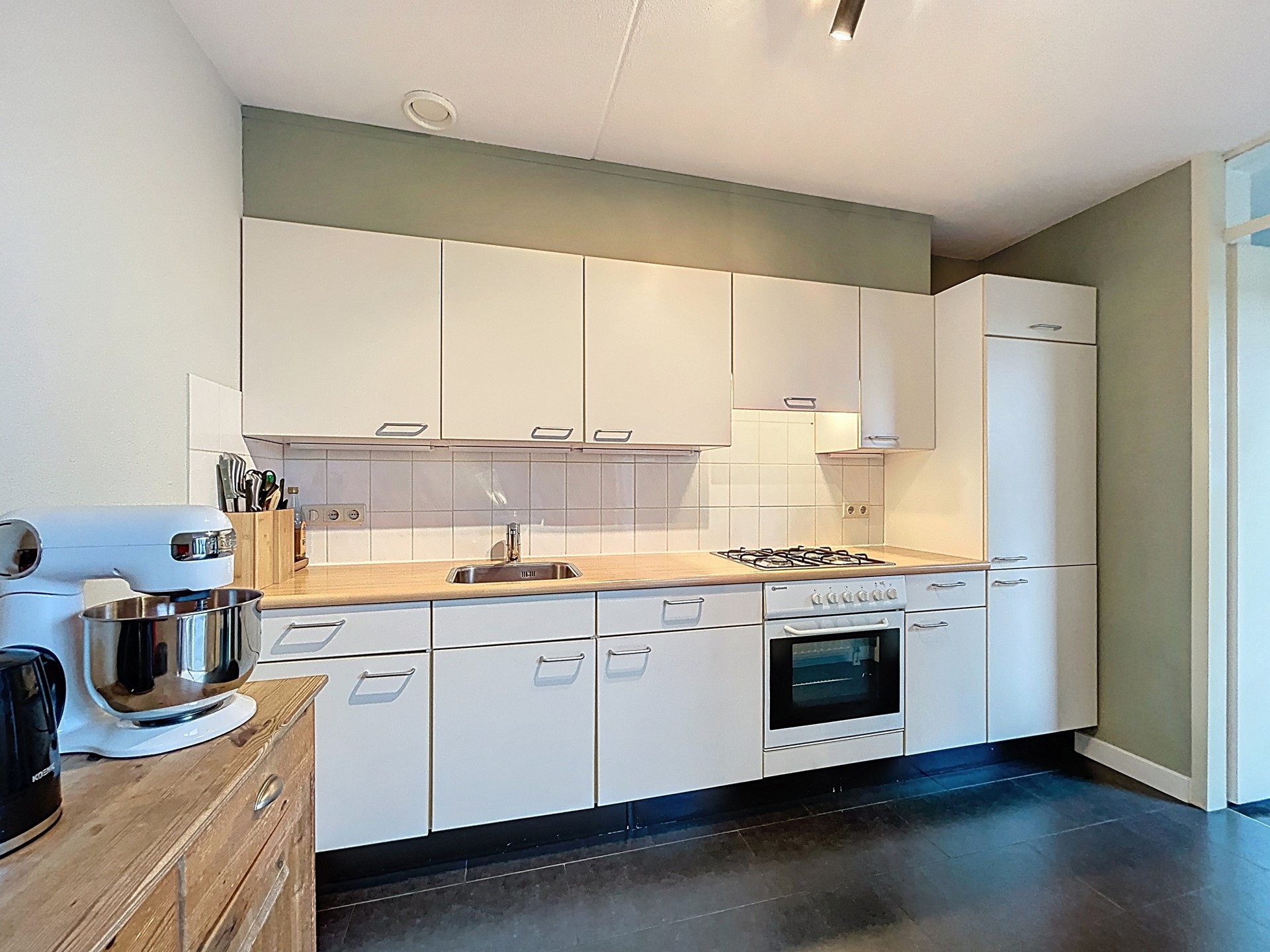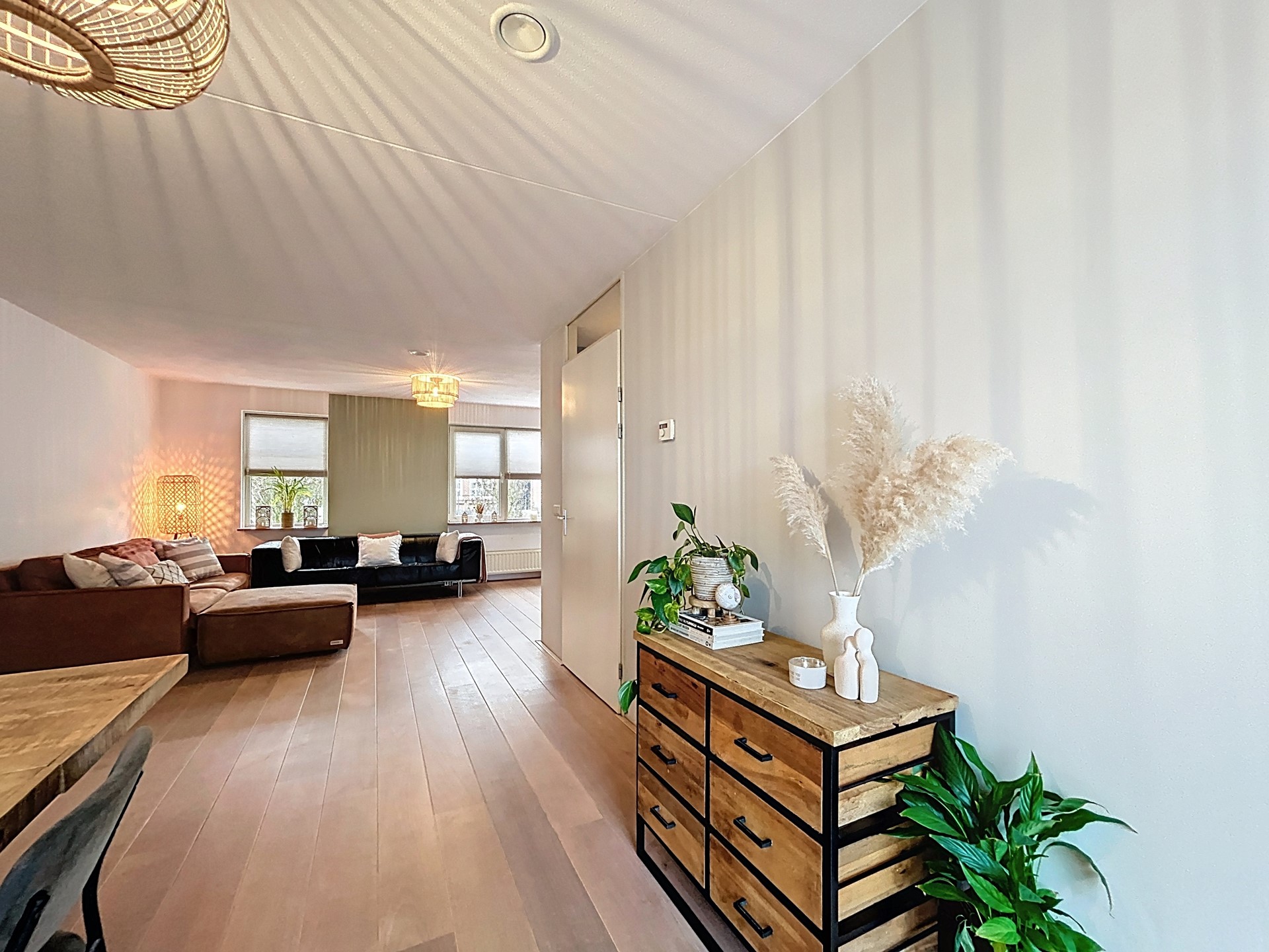 We betreden de woning middels de voordeur om in de hal de rondleiding te starten. Deze hal biedt plaats voor het toilet, de meterkast en de trap. Vervolgens betreden we de L-vormige woonkamer. Hier wordt pas echt duidelijk hoeveel ruimte er in de woning zit. Je hebt echt alle ruimte voor een lange eettafel en een royale gezellige zithoek. De lichte houten parketvloer zorgt voor extra sfeer en de grote raampartijen en de schuifpui zorgen voor veel lichtinval. De schuifpui biedt toegang tot het terras en vanaf de eettafel is daardoor ook de polder al te zien. Aansluitend staat de keuken in een open verbinding met de kamer. Deze keuken is voorzien van een koelkast, oven, 4 gaspitten en afzuiging. Vervolgens betreden we de bijkeuken met de witgoedvoorzieningen en de CV-ketel uit 2011. Tenslotte wordt langs hier ook de ruime garage betreden.