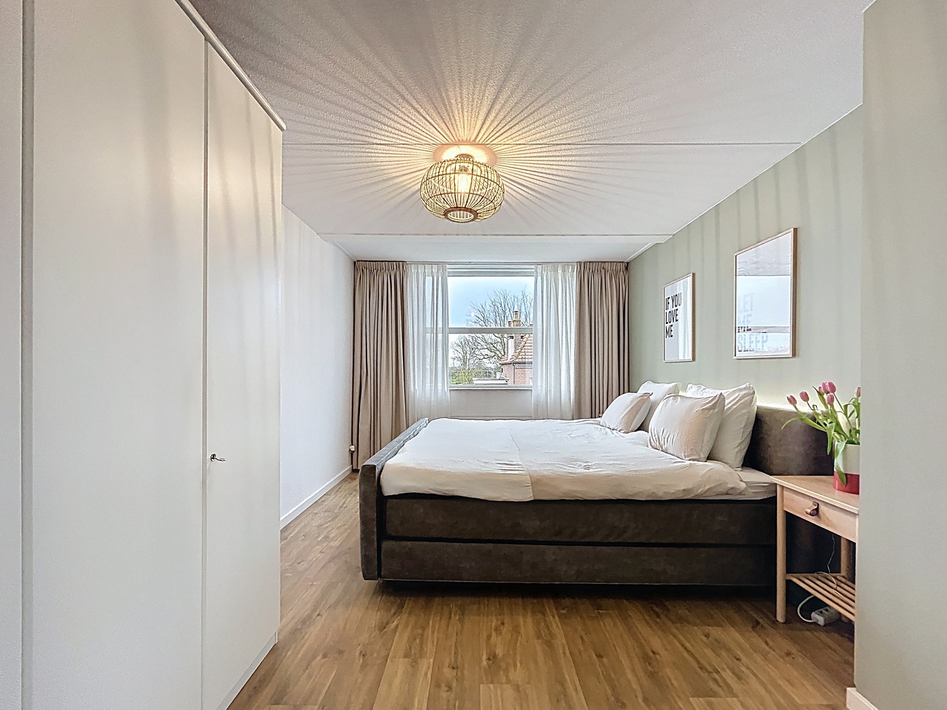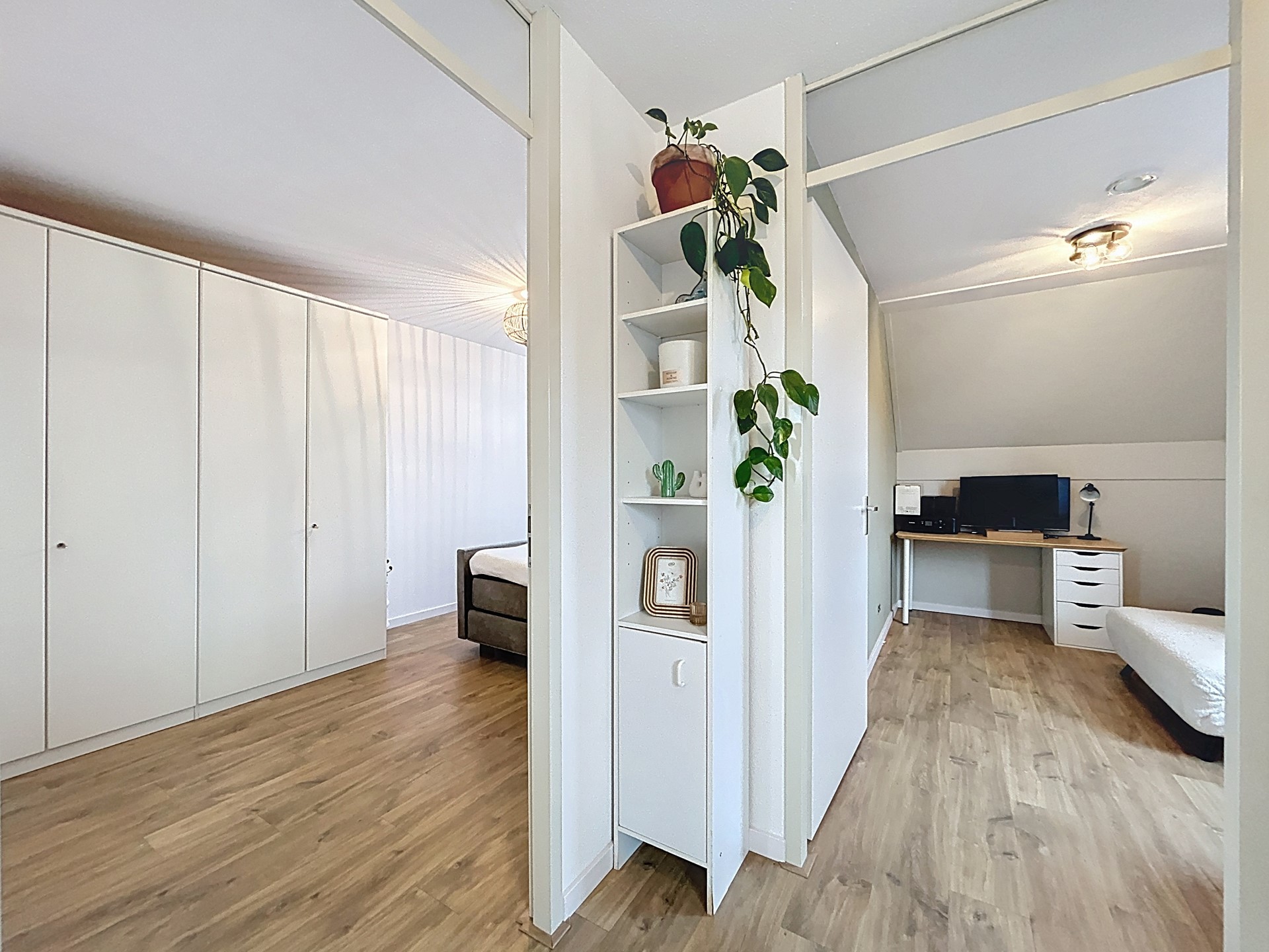 De overloop van de eerste verdieping biedt toegang tot de drie slaapkamers en de ruime badkamer. Opvallend hier is gelijk de ruimte van de overloop en de fraaie laminaatvloer die netjes tussen alle ruimtes door loopt. De master bedroom is ook echt weer royaal met genoeg ruimte voor een tweepersoonsbed, kledingkast en een bureau. De tweede slaapkamer is ook nog groot genoeg voor een tweepersoonsbed en kledingkast en de derde slaapkamer is een leuke kinderkamer met ruimte voor een éénpersoonsbed, kast en bureau. Tenslotte betreden we de chique badkamer met douchecabine, toilet en wastafel.